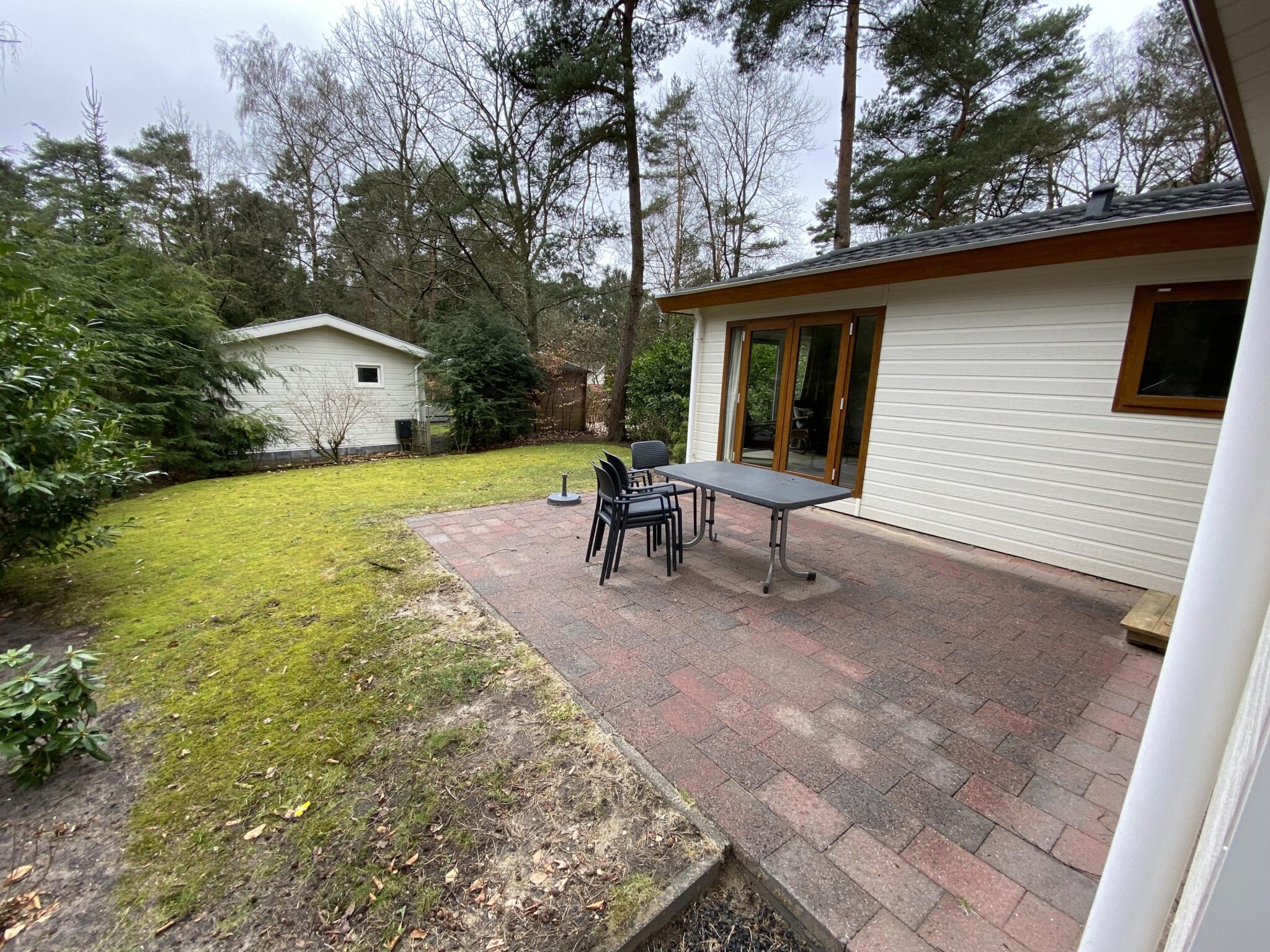 Der Bungalow verfügt zwar über keinen eigenen Garten, doch die herrliche natürliche Umgebung des Parks lädt zum Entspannen, Spazierengehen oder einfach zum Genießen der Ruhe ein. Hier wohnen Sie mitten in der Natur.