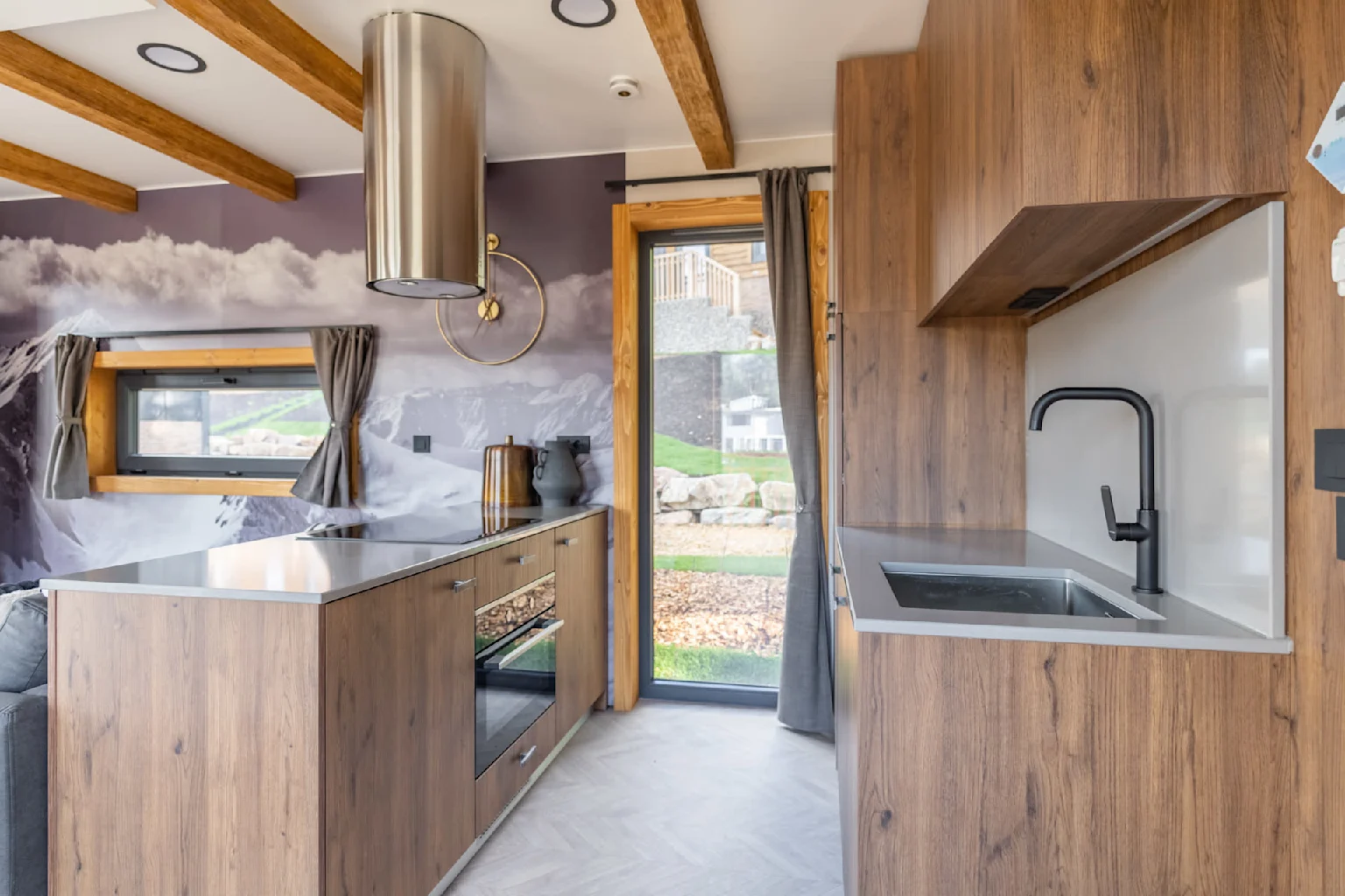 Das helle Wohnzimmer verfügt über eine gemütliche Sitzecke mit Fernseher und einen Essbereich, in dem Sie gemeinsam frühstücken, zu Abend essen oder Spieleabende veranstalten können. Die offene Küche ist modern eingerichtet und mit praktischen Geräten ausgestattet, darunter ein Geschirrspüler, ein Backofen, eine Mikrowelle und eine Filterkaffeemaschine – alles, was Sie für einen sorgenfreien Aufenthalt benötigen.
