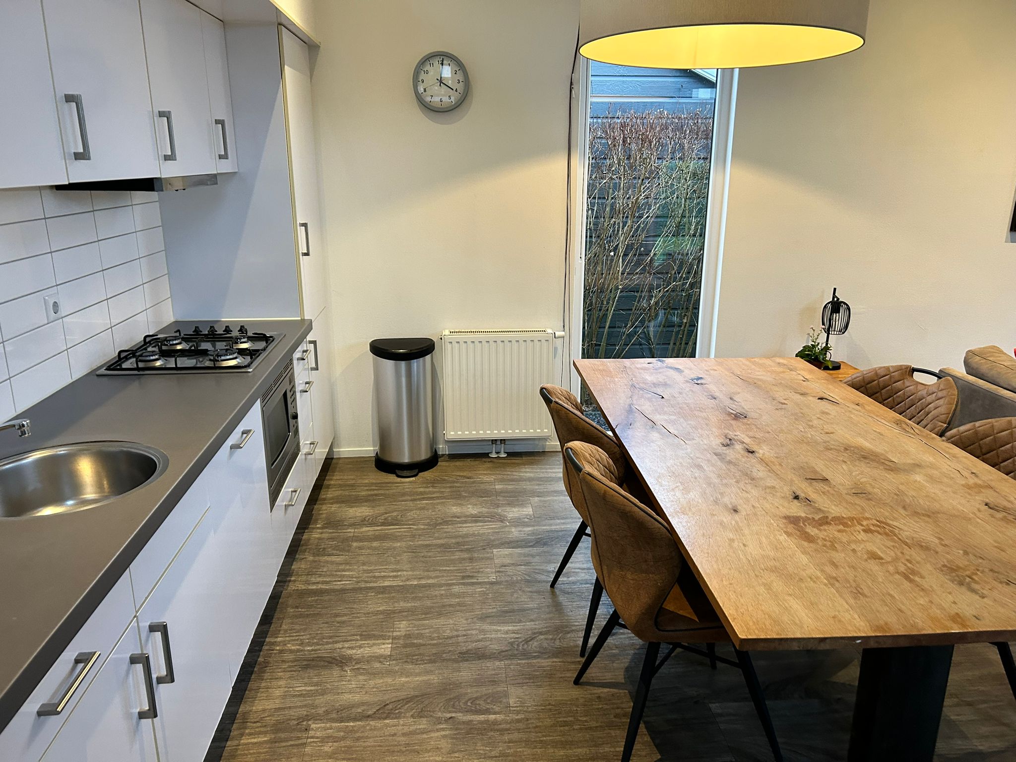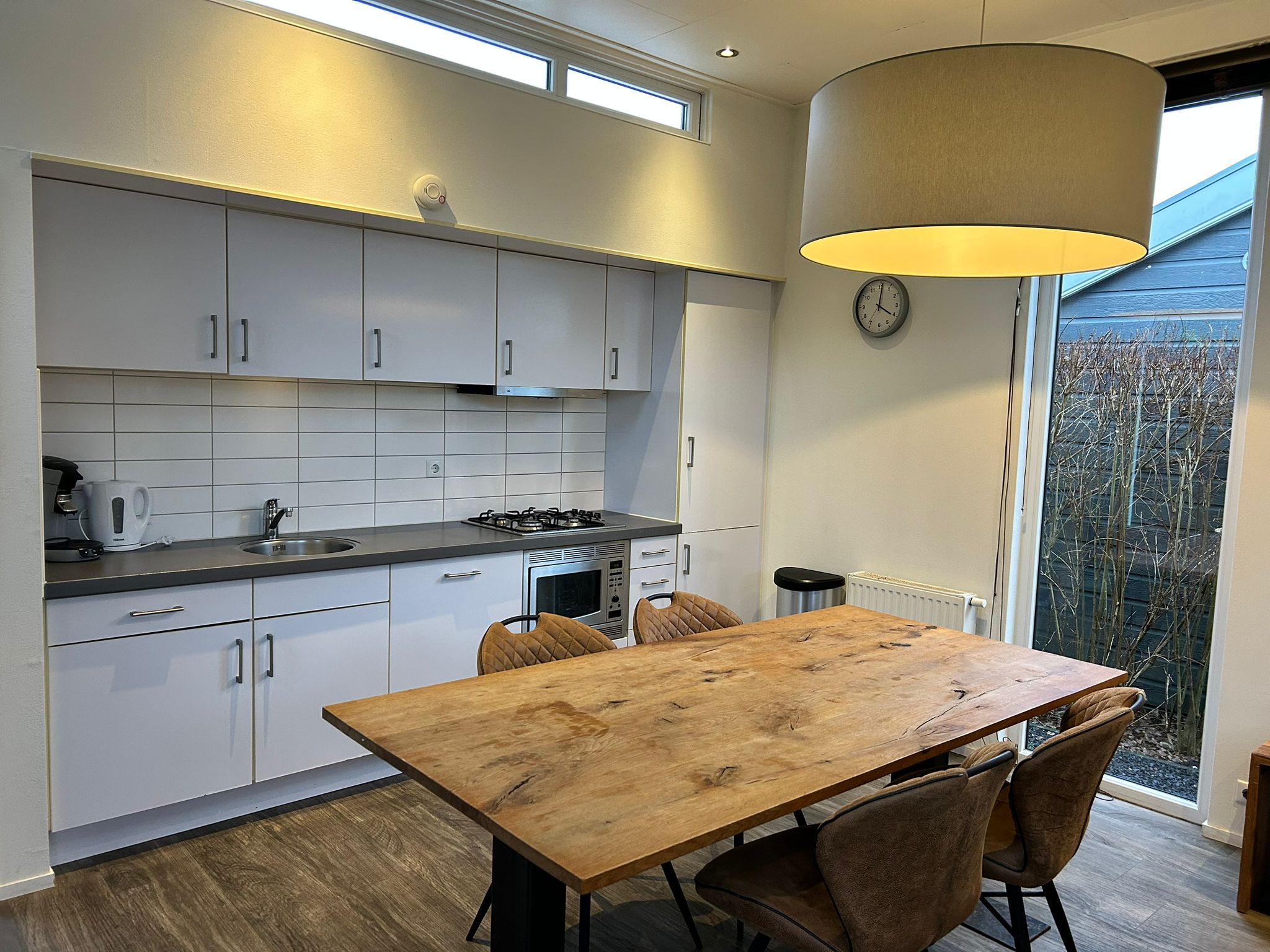 Der Essbereich ist mit einem Holzesstisch und vier Stühlen ausgestattet und steht in direkter Verbindung zur gepflegten offenen Küche. Die Küche verfügt über eine Kühl-Gefrierkombination, eine Kombi-Mikrowelle, einen Geschirrspüler sowie ein Gas-Kochfeld mit Dunstabzugshaube.