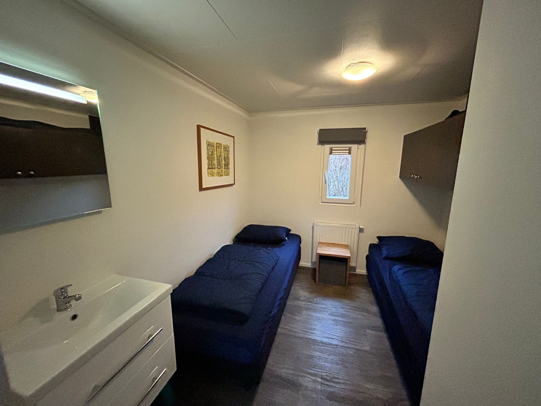 Die insgesamt vier Schlafplätze verteilen sich auf zwei Schlafzimmer. Das Hauptschlafzimmer ist mit einem Doppelbett ausgestattet und bietet auf beiden Seiten Schränke mit ausreichend Stauraum. Im zweiten Schlafzimmer befinden sich zwei Einzelbetten. Auch hier ist oberhalb der Betten zusätzlicher Stauraum vorhanden.