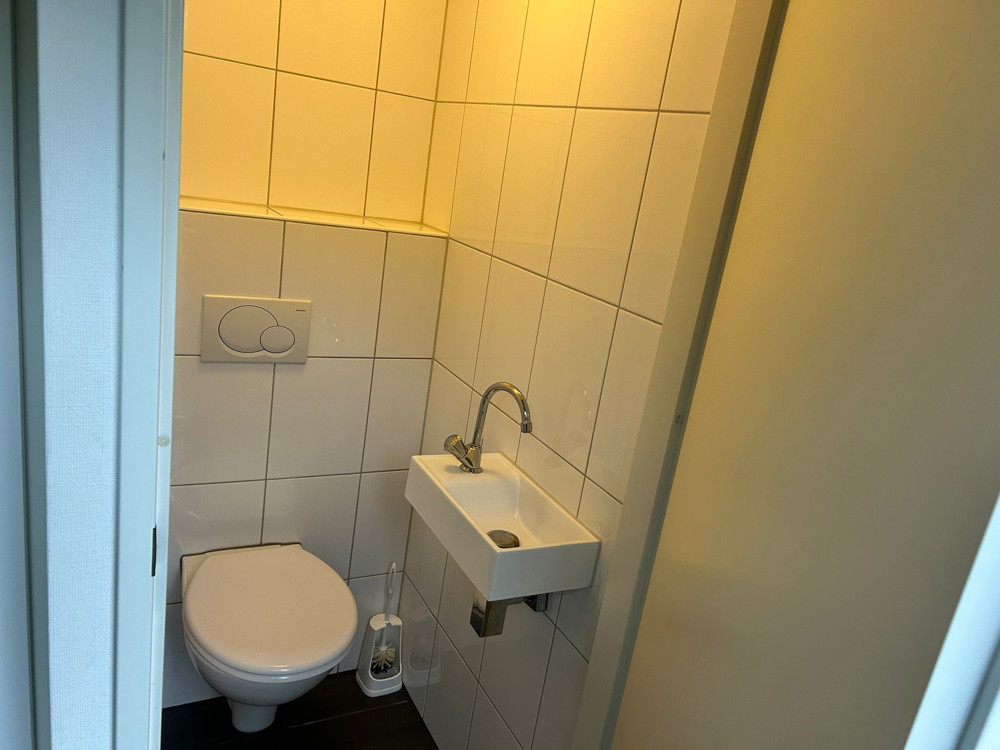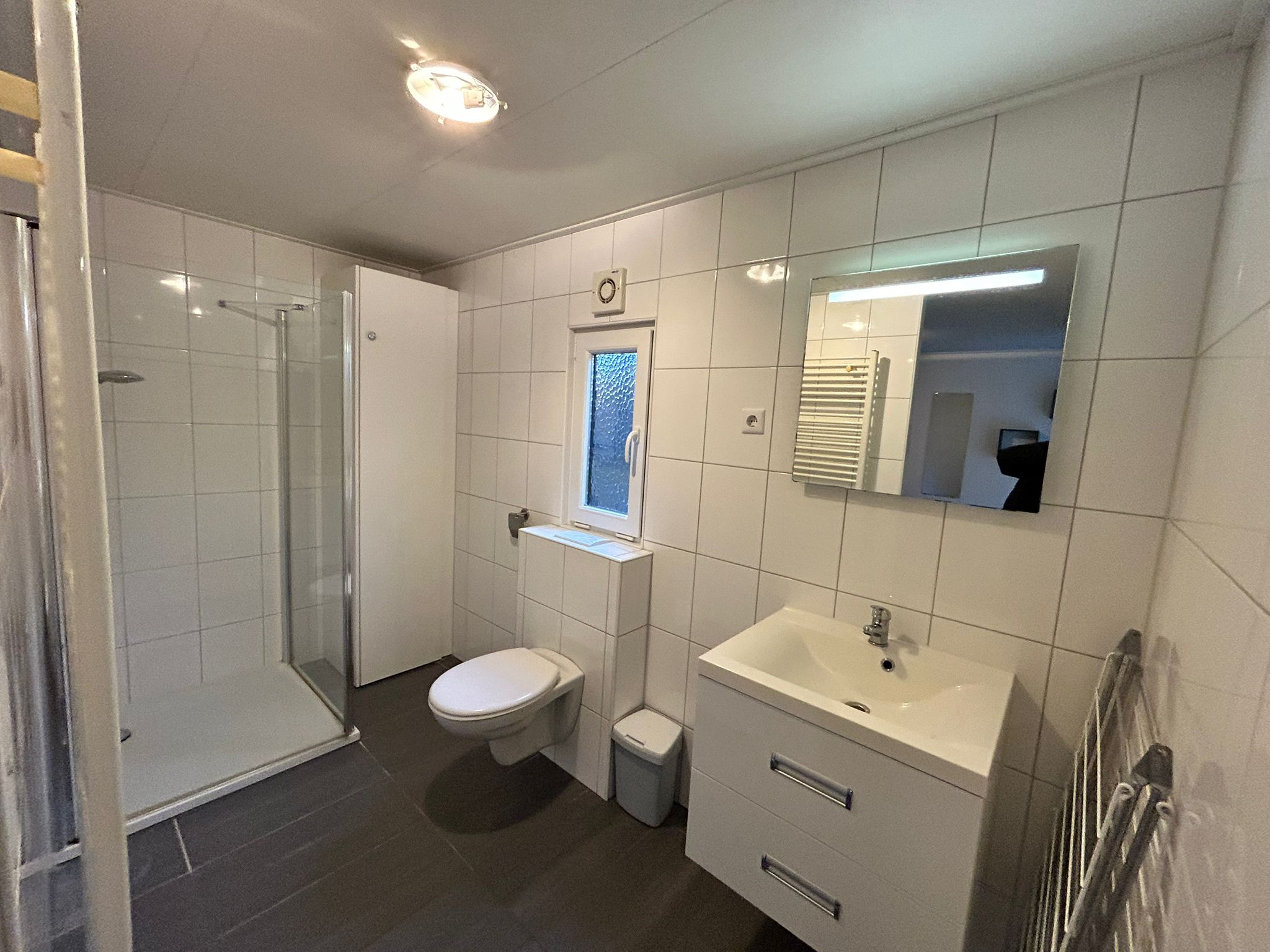 Das großzügige Badezimmer ist vollständig gefliest und mit einer Duschkabine, einem wandhängenden WC, einem Designheizkörper sowie einem Waschbecken mit Spiegel ausgestattet. Zusätzlich verfügt die Wohnung über ein separates Gäste-WC.
