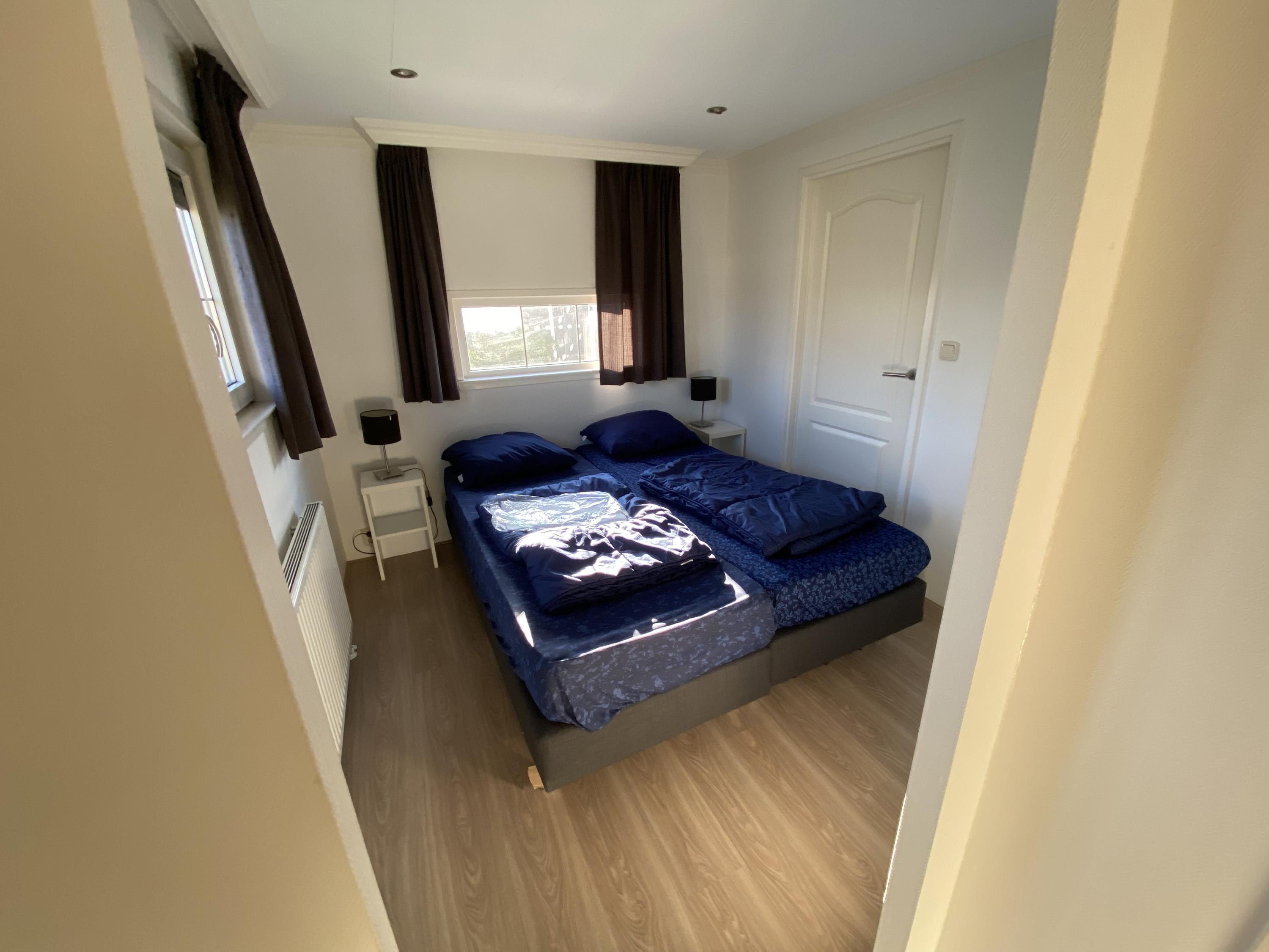 Dankzij de twee slaapkamers zijn er vier slaapplaatsen. De hoofdslaapkamer is ingericht met twee aan elkaar geschoven eenpersoonsbedden, elk met een nachtkastje aan weerszijden. Aan opbergruimte is geen gebrek door de kast in de kamer. In de tweede slaapkamer staan twee eenpersoonsbedden en een kast.
