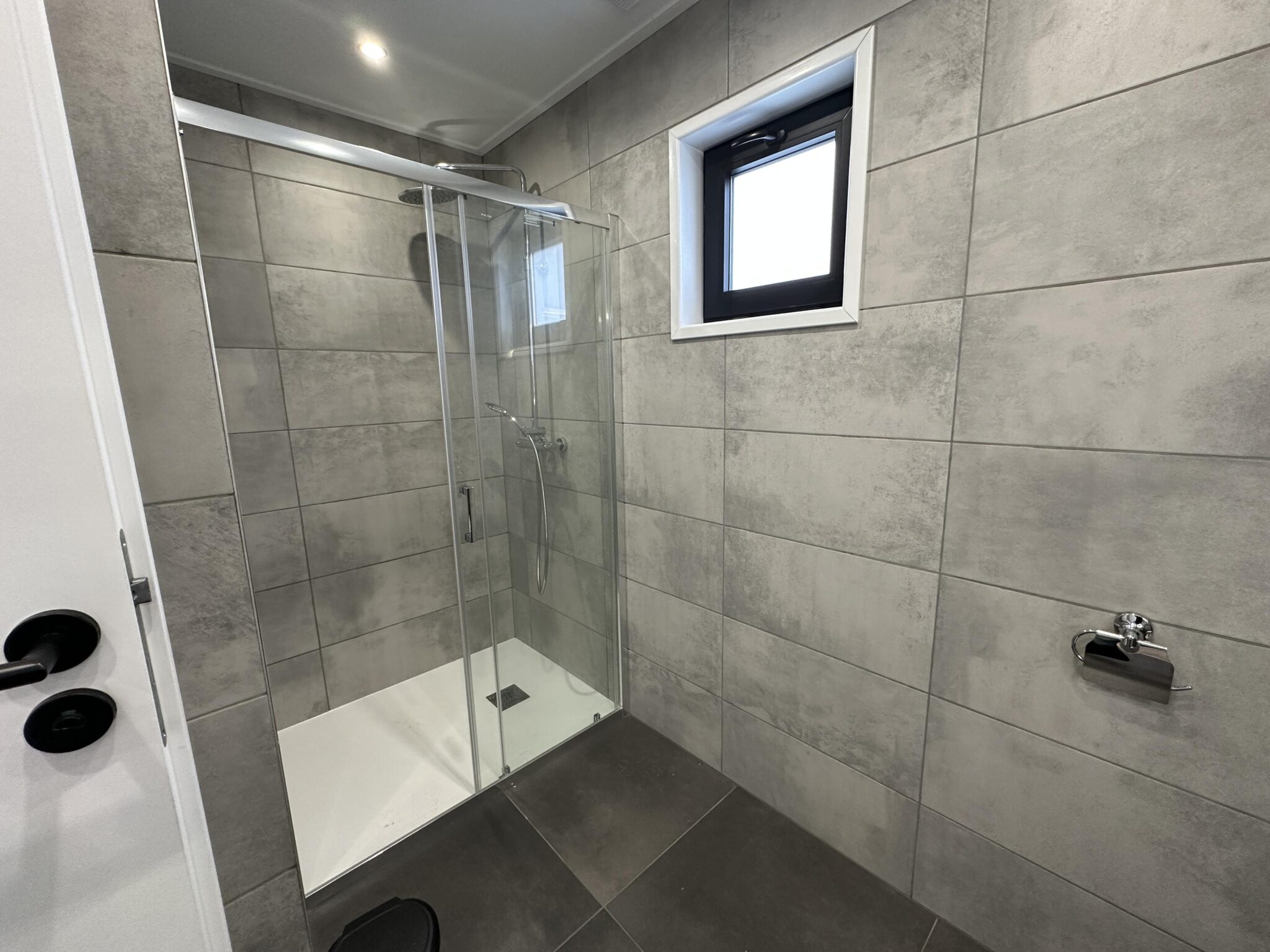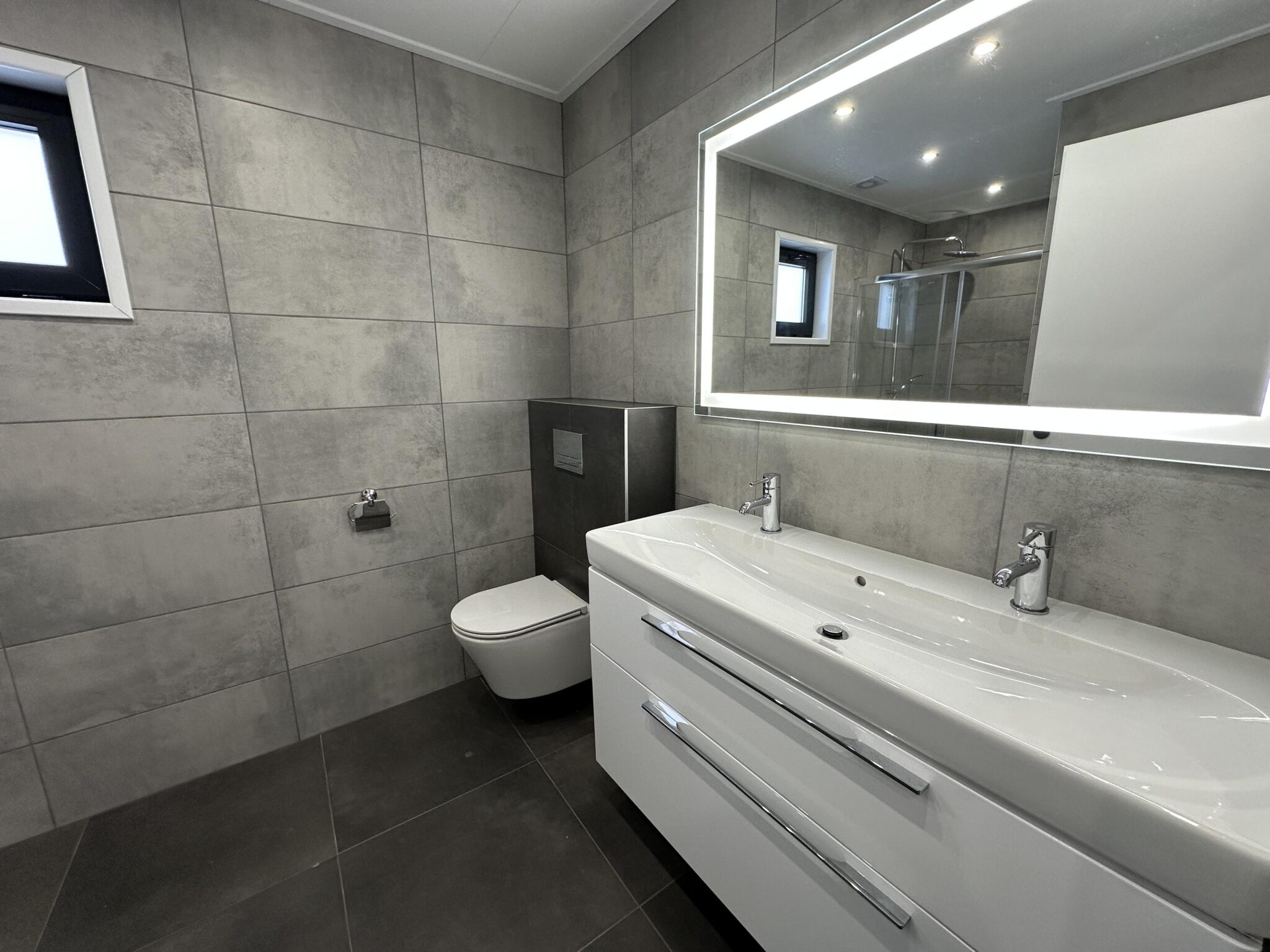Das moderne Badezimmer ist komplett gefliest. Hier finden Sie die geräumige Duschkabine mit Regendusche, eine Toilette, den Design-Heizkörper und das Waschbecken mit beleuchtetem Spiegel. Es gibt auch eine separate Toilette im Haus.