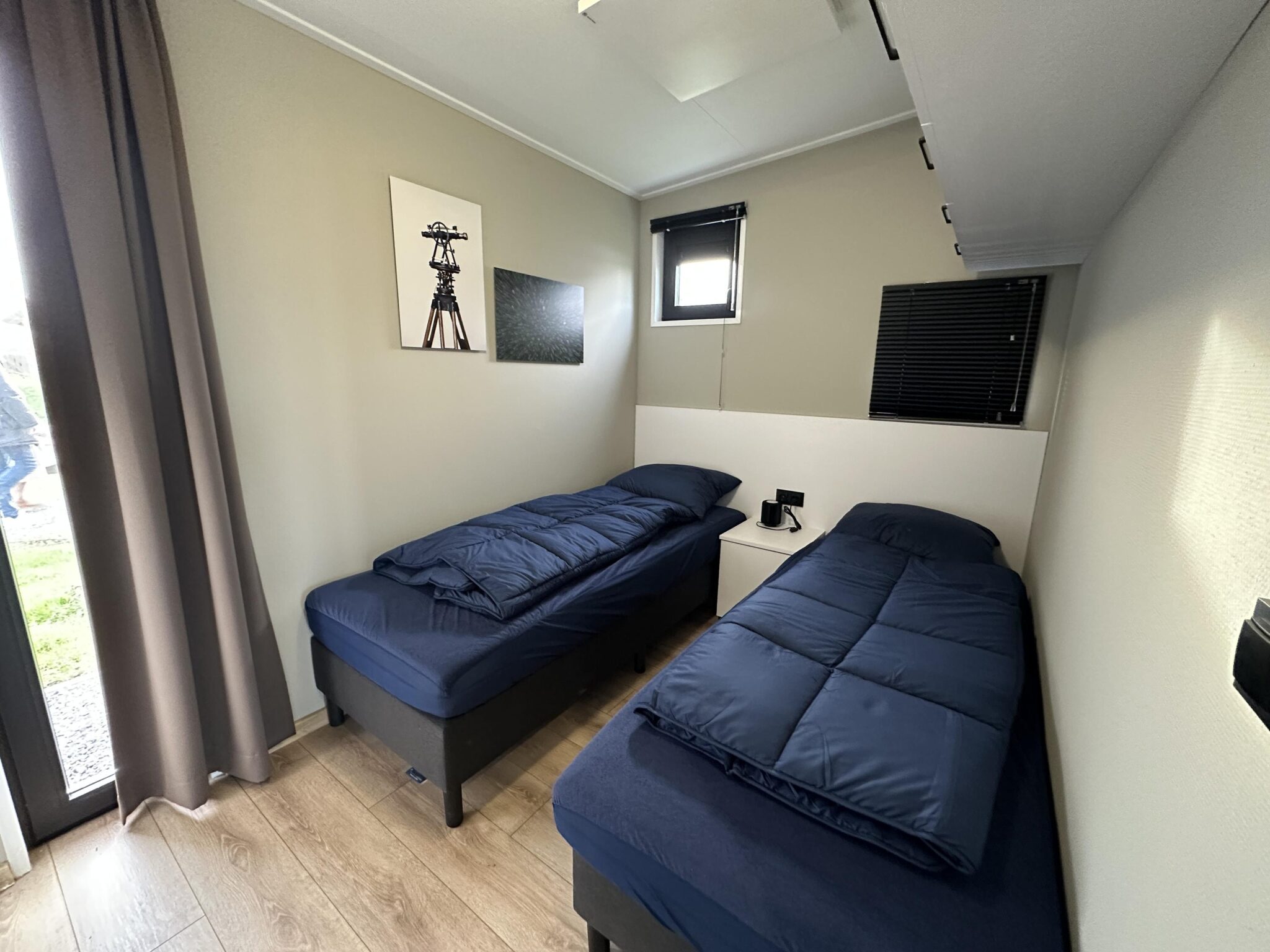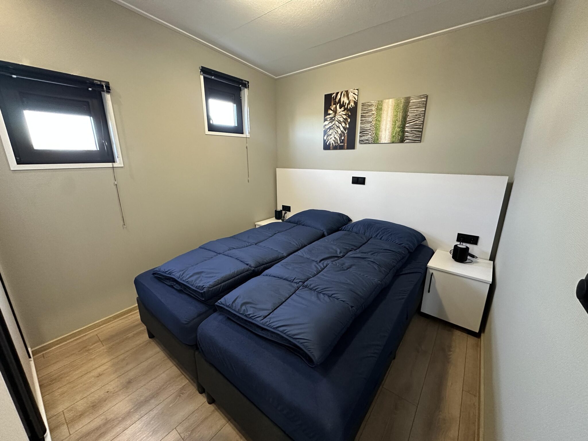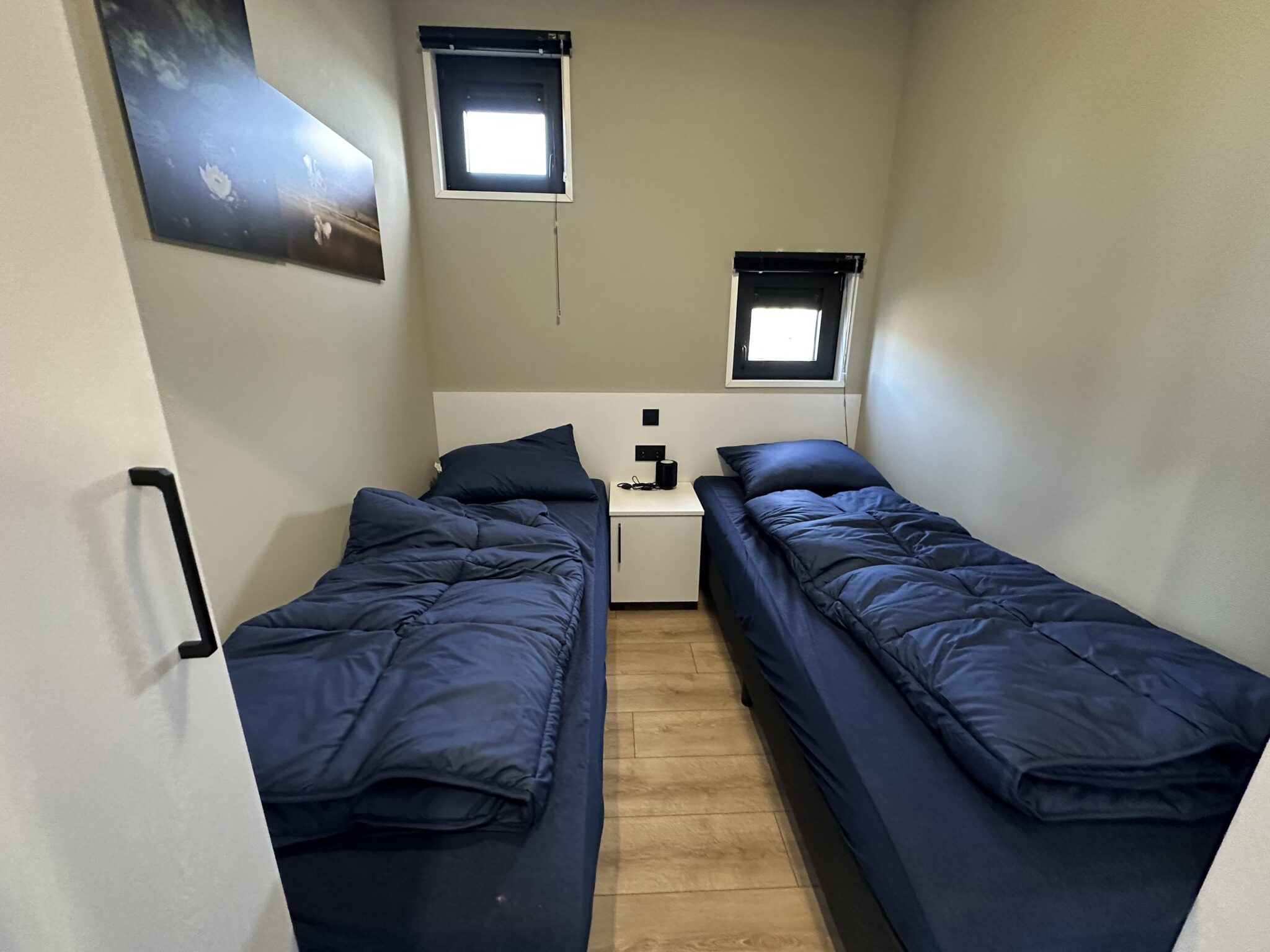 Mit drei Schlafzimmern bietet es Platz für sechs Personen. Das Hauptschlafzimmer ist mit zwei zusammengeschobenen Einzelbetten und einem Nachttisch auf beiden Seiten ausgestattet. Dank des geräumigen Einbauschranks gegenüber dem Bett fehlt es nicht an Stauraum. Das zweite Schlafzimmer hat zwei Einzelbetten und einen Kleiderschrank. Das dritte Schlafzimmer hat ebenfalls zwei Einzelbetten. Für Stauraum sorgen zwei Schränke am Fußende.