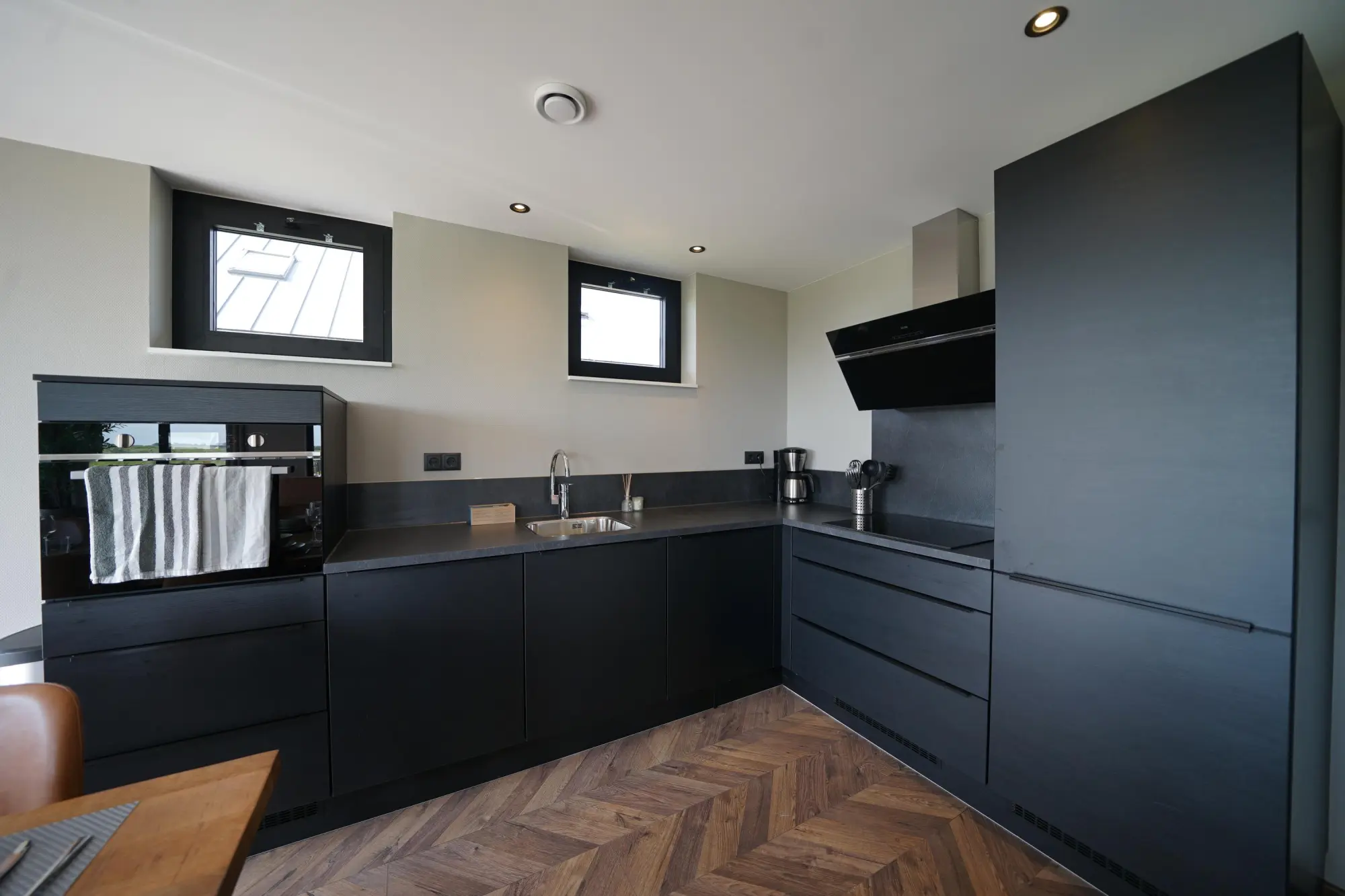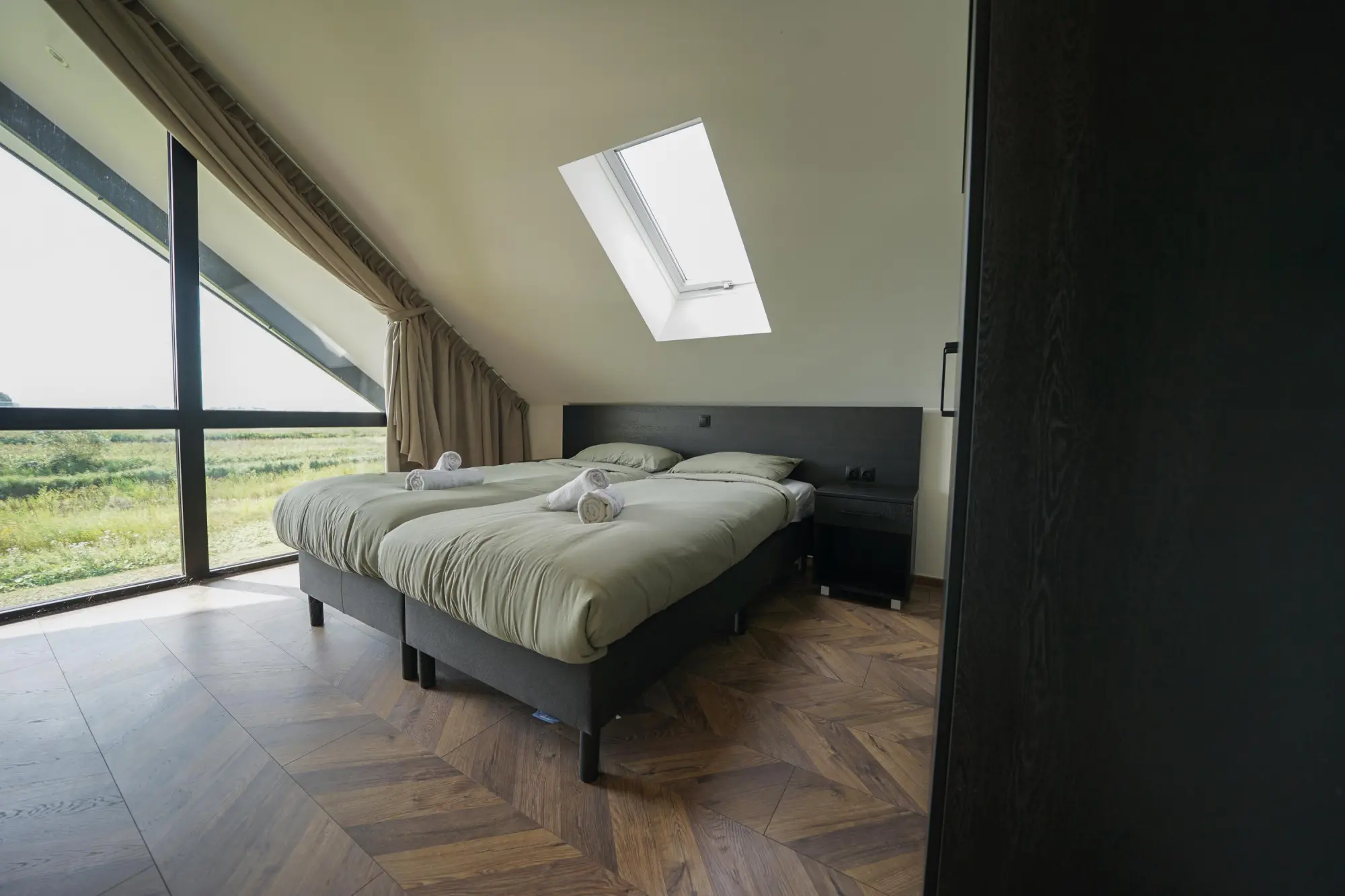 Im Obergeschoss befinden sich nicht weniger als vier Schlafzimmer, wiederum lichtdurchflutet durch die großen (Dach-)Fenster. Außerdem findet sich auf dieser Etage ein Badezimmer mit Dusche, Waschbecken und Toilette.