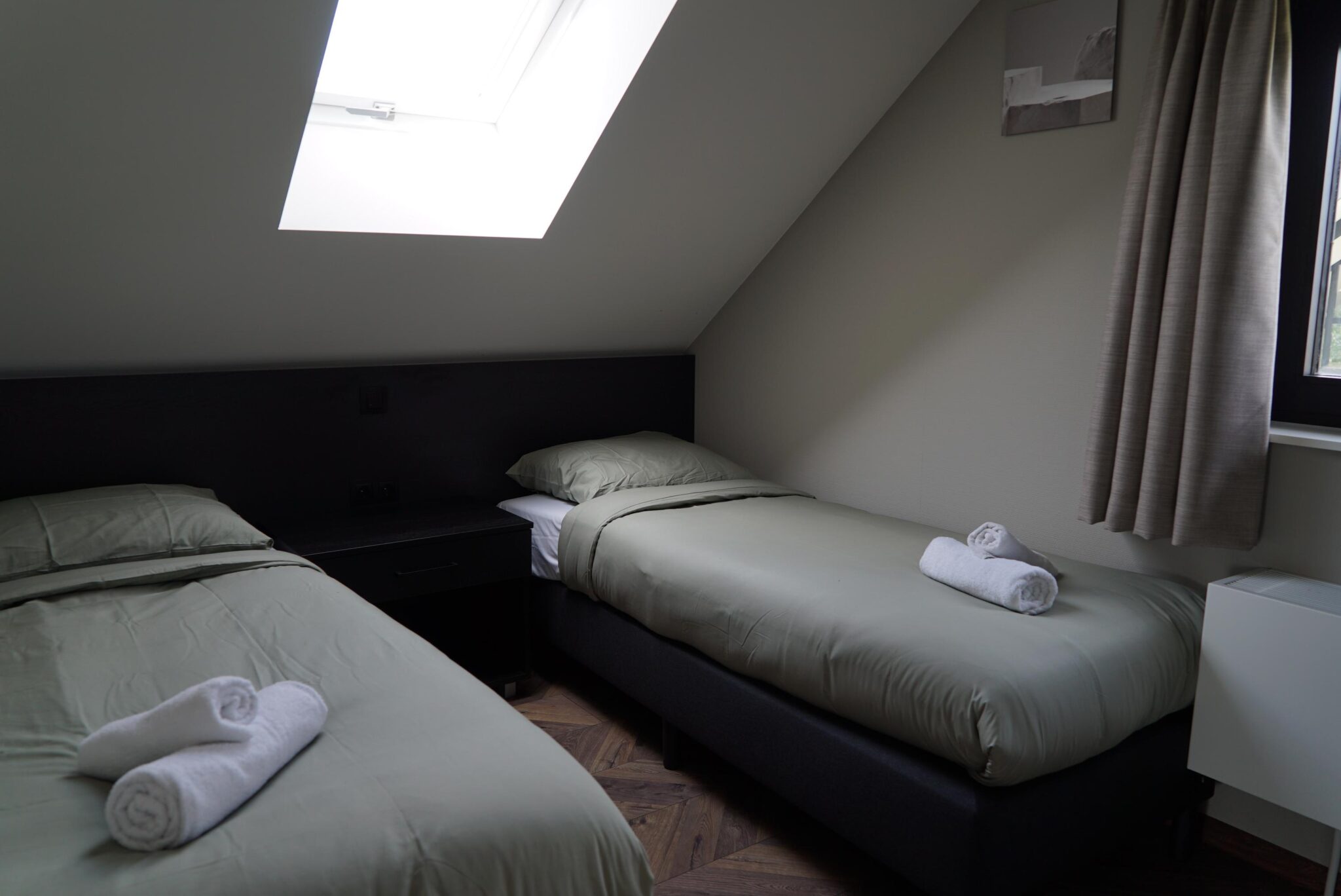 Im Obergeschoss befinden sich nicht weniger als vier Schlafzimmer, wiederum lichtdurchflutet durch die großen (Dach-)Fenster. Außerdem findet sich auf dieser Etage ein Badezimmer mit Dusche, Waschbecken und Toilette.