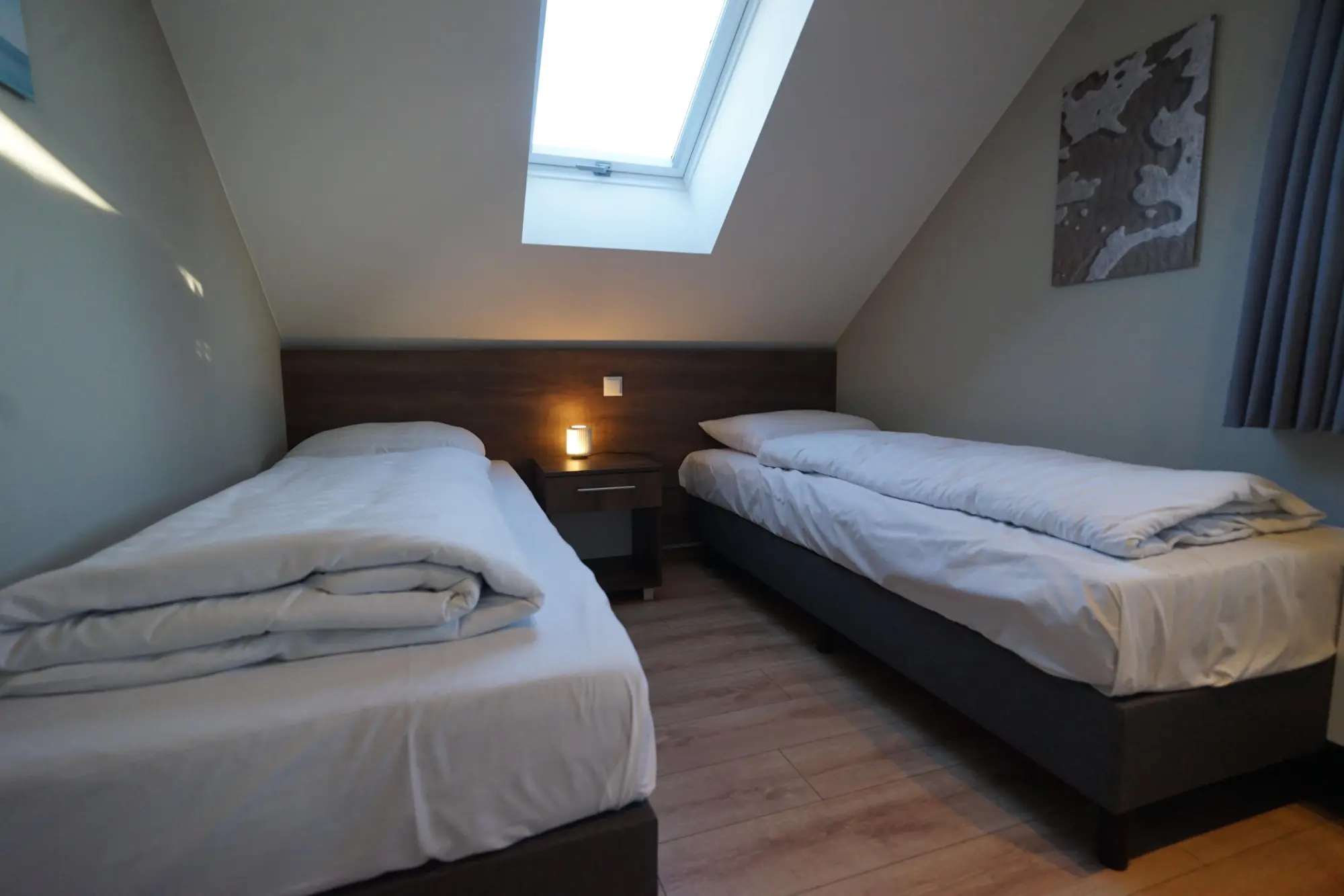 Im Obergeschoss befinden sich nicht weniger als vier Schlafzimmer, wiederum lichtdurchflutet durch die großen (Dach-)Fenster. Außerdem findet sich auf dieser Etage ein Badezimmer mit Dusche, Waschbecken und Toilette.