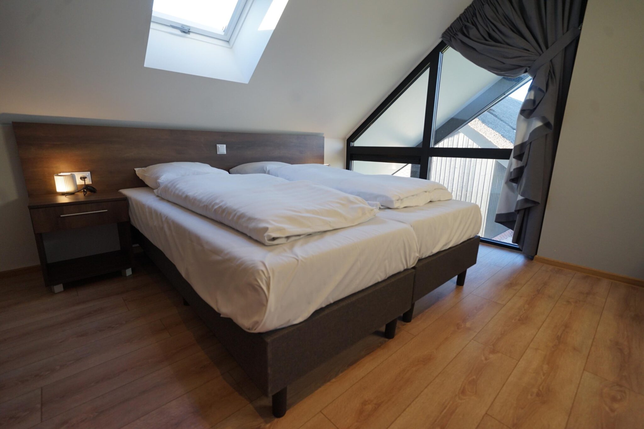 Im Obergeschoss befinden sich nicht weniger als vier Schlafzimmer, wiederum lichtdurchflutet durch die großen (Dach-)Fenster. Außerdem findet sich auf dieser Etage ein Badezimmer mit Dusche, Waschbecken und Toilette.