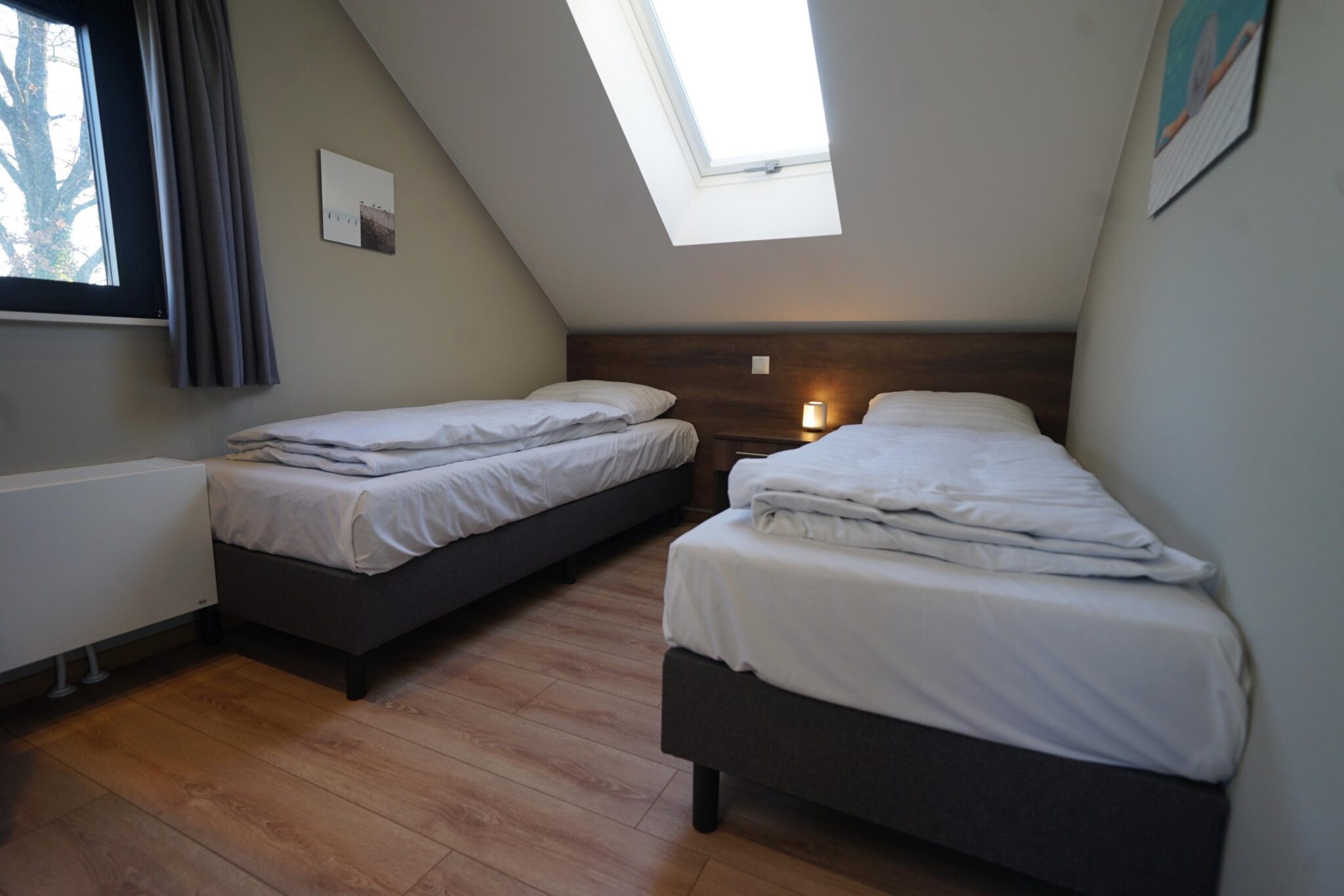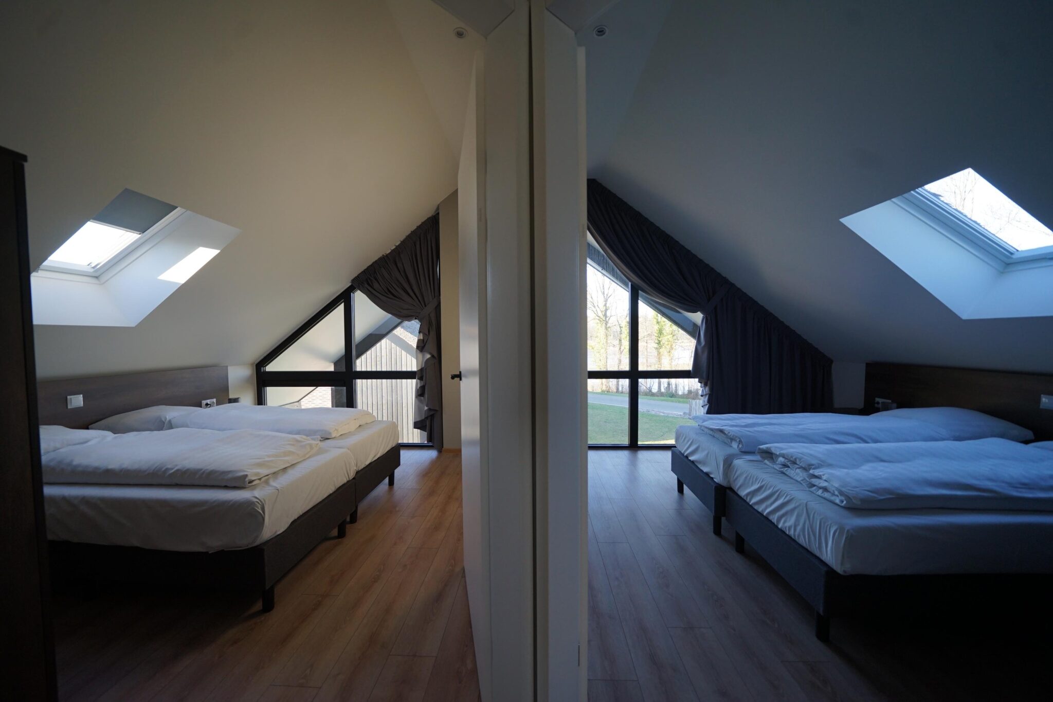 Im Obergeschoss befinden sich nicht weniger als vier Schlafzimmer, wiederum lichtdurchflutet durch die großen (Dach-)Fenster. Außerdem findet sich auf dieser Etage ein Badezimmer mit Dusche, Waschbecken und Toilette.