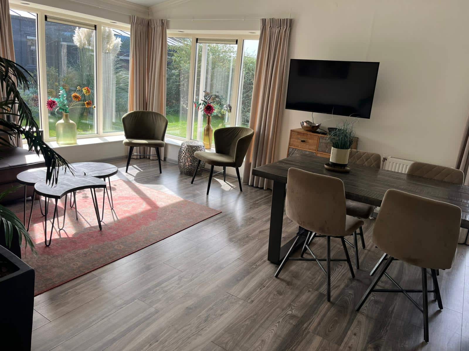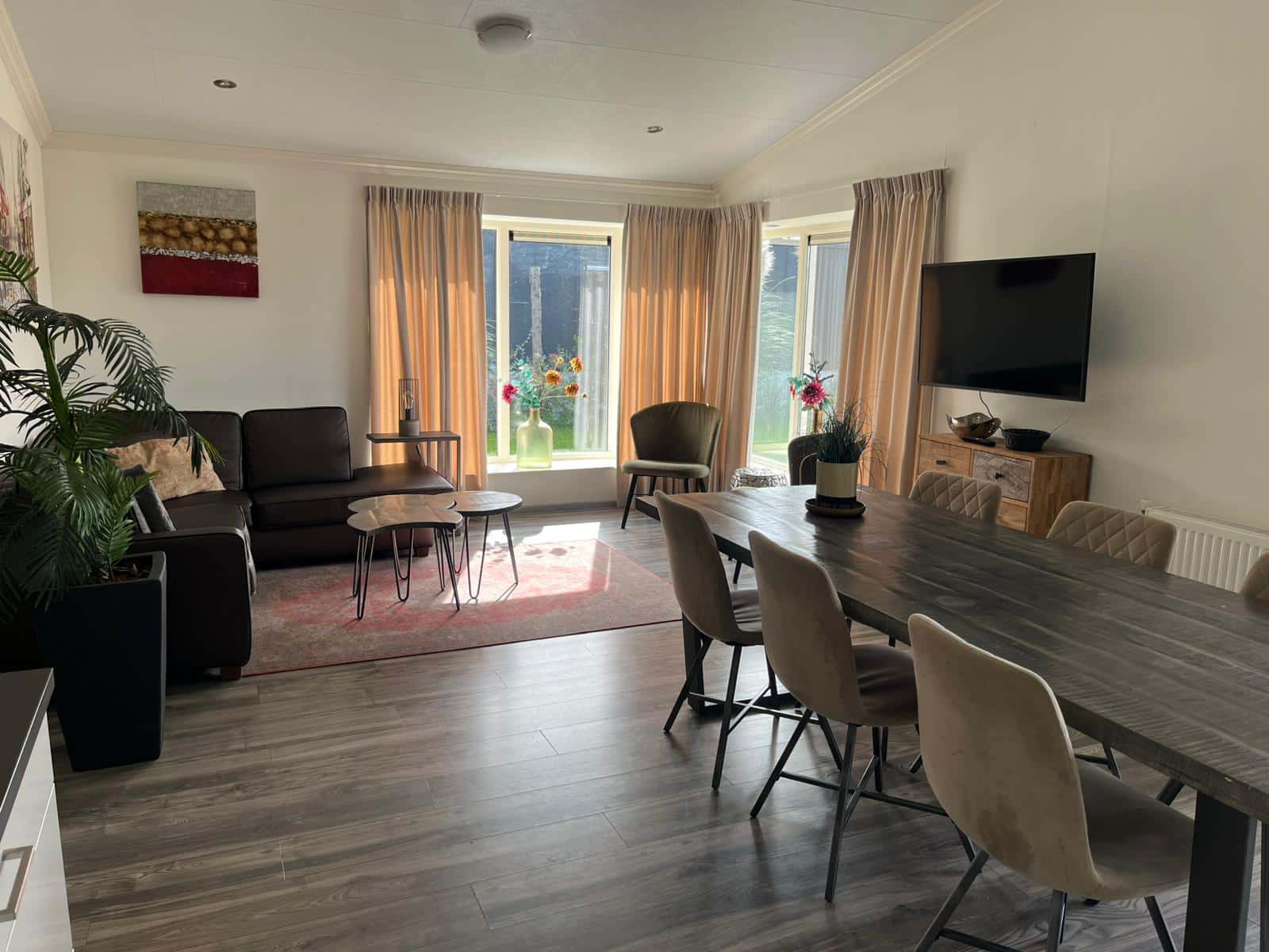 Der sonnige Wohnbereich ist großzügig gestaltet und beherbergt die Sitzecke, den Essbereich sowie die Küche. Dank der großen Fensterfronten genießen Sie viel Tageslicht und einen wunderschönen Ausblick. Die stilvolle Sitzecke ist mit einer Eckcouch, zwei Sesseln, zwei Couchtischen, einem Beistelltisch sowie einem TV-Möbel mit Fernseher ausgestattet. Der TV-Empfang erfolgt über einen CAI-Anschluss, zudem steht Ihnen WLAN in der Unterkunft zur Verfügung.