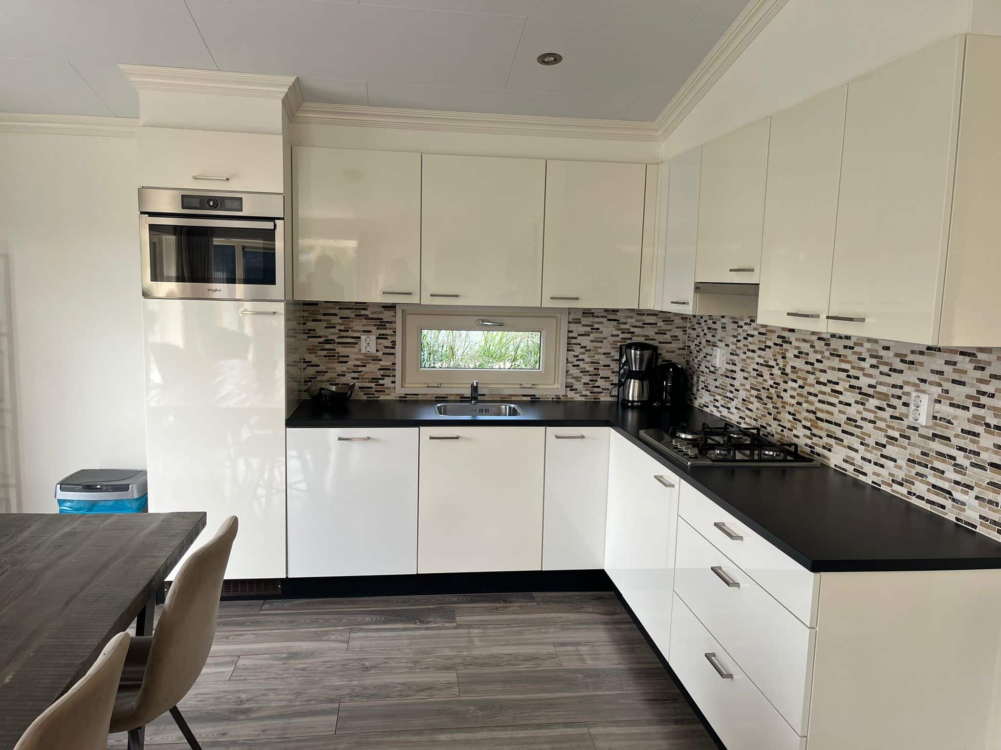 Angrenzend befinden sich der Essbereich und die Küche. Der Essbereich ist mit einem Holzesstisch und sechs Stühlen eingerichtet. Die moderne, offene Eckküche in weißem Design verfügt über die notwendige Einbauausstattung, darunter ein Kühlschrank mit Gefrierfach, eine (Kombi-)Mikrowelle, ein Geschirrspüler sowie ein Gasherd mit Dunstabzugshaube.