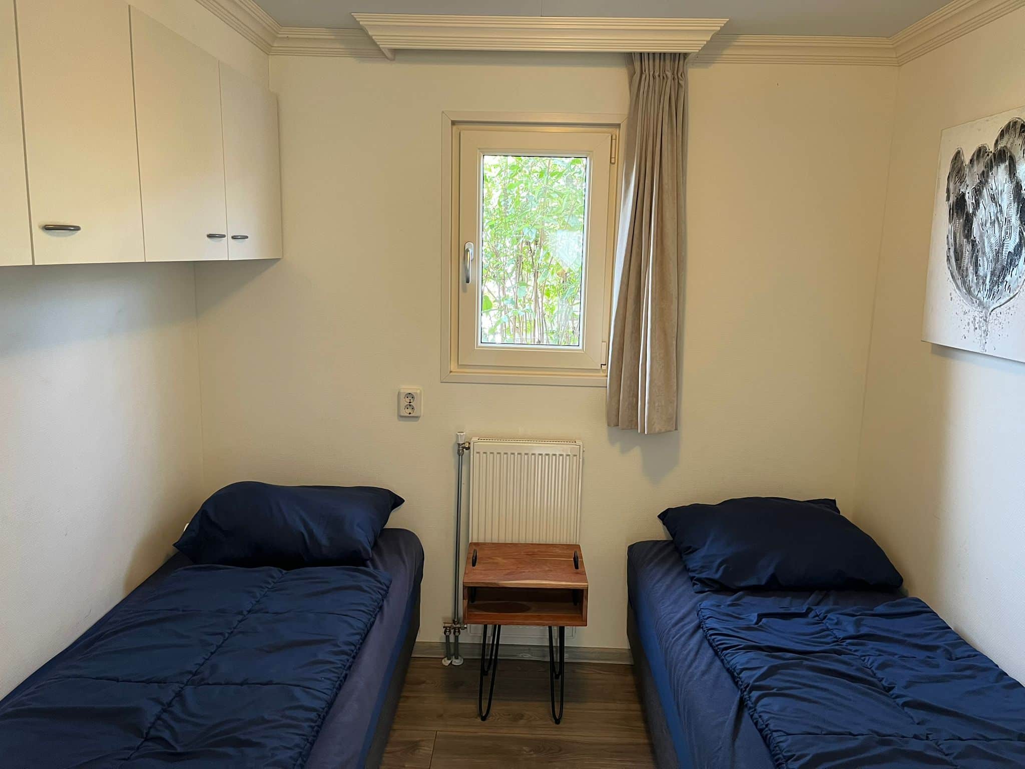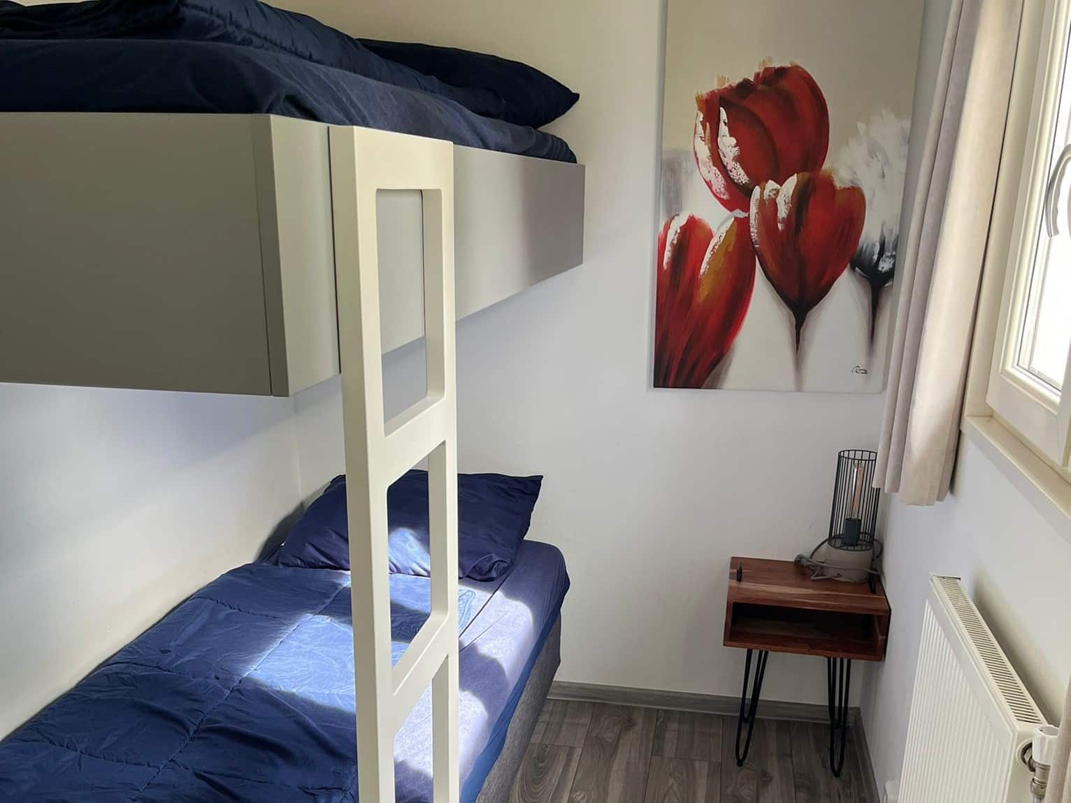 Die Unterkunft verfügt über drei Schlafzimmer mit insgesamt sechs Schlafplätzen. Das großzügige Hauptschlafzimmer ist mit zwei zusammengeschobenen Einzelbetten sowie Nachttischen auf beiden Seiten ausgestattet. Für ausreichend Stauraum sorgt ein Einbauschrank. Im zweiten Schlafzimmer befinden sich zwei Einzelbetten mit Stauraummöglichkeiten darüber. Das dritte Schlafzimmer ist mit einem Etagenbett ausgestattet. Zusätzlich gibt es einen integrierten Abstellraum mit extra Stauraum sowie der Möglichkeit, eine Waschmaschine und einen Trockner aufzustellen. Dieser Raum verfügt über Stromanschluss und beherbergt die Heizungsanlage.