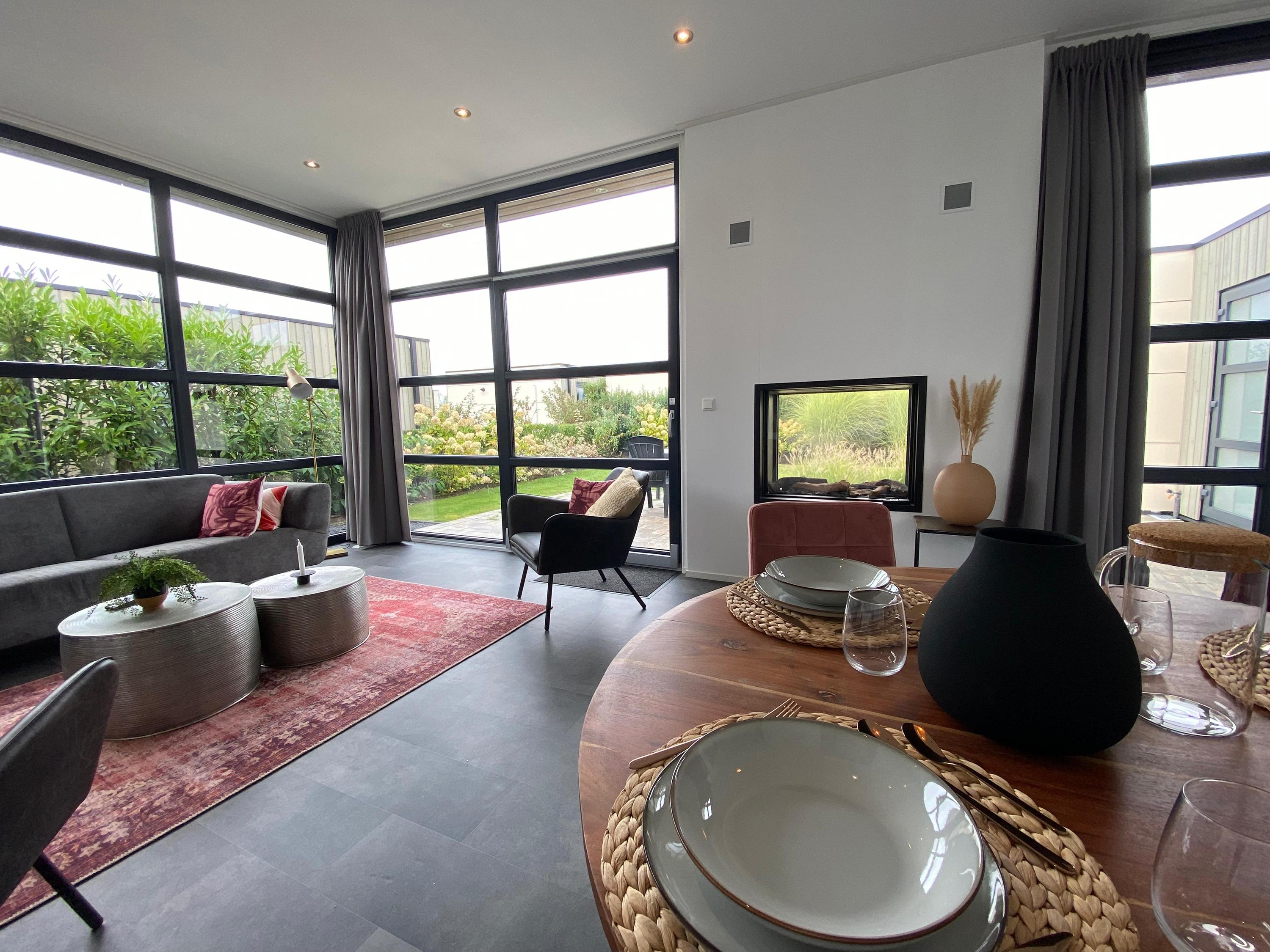 Die beiden Schlafzimmer sind mit jeweils 2 Betten ausgestattet. Im Badezimmer gibt es eine Dusche, eine Toilette und ein Waschbecken. Das geräumige Wohnzimmer mit der voll ausgestatteten offenen Küche vermittelt eine gemütliche Atmosphäre, in der man sich sofort wohlfühlt. Auch die große Terrasse trägt dazu bei. In Kombination mit den großen Fenstern verbindet sie den Innen- und Außenbereich des Ferienhauses.