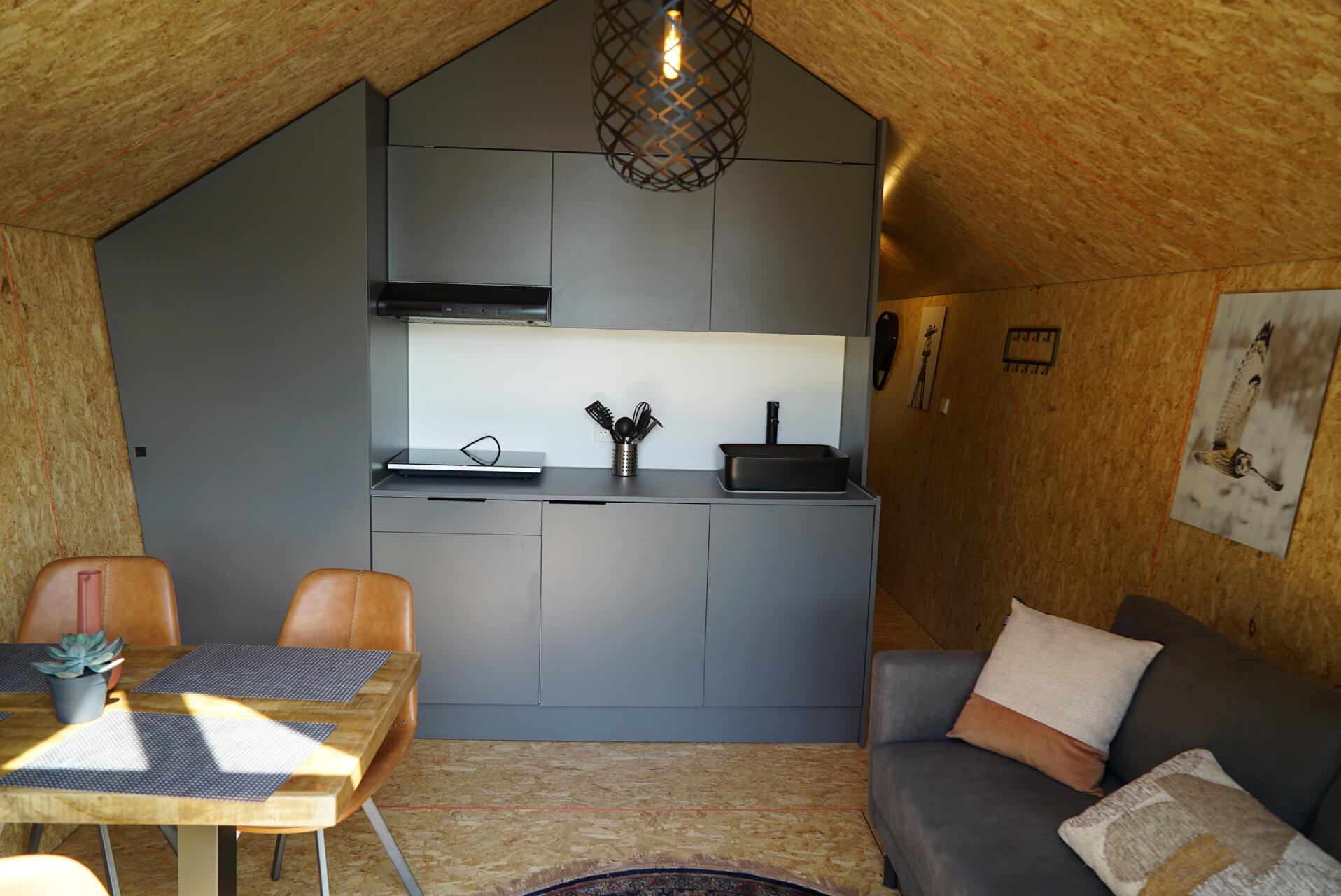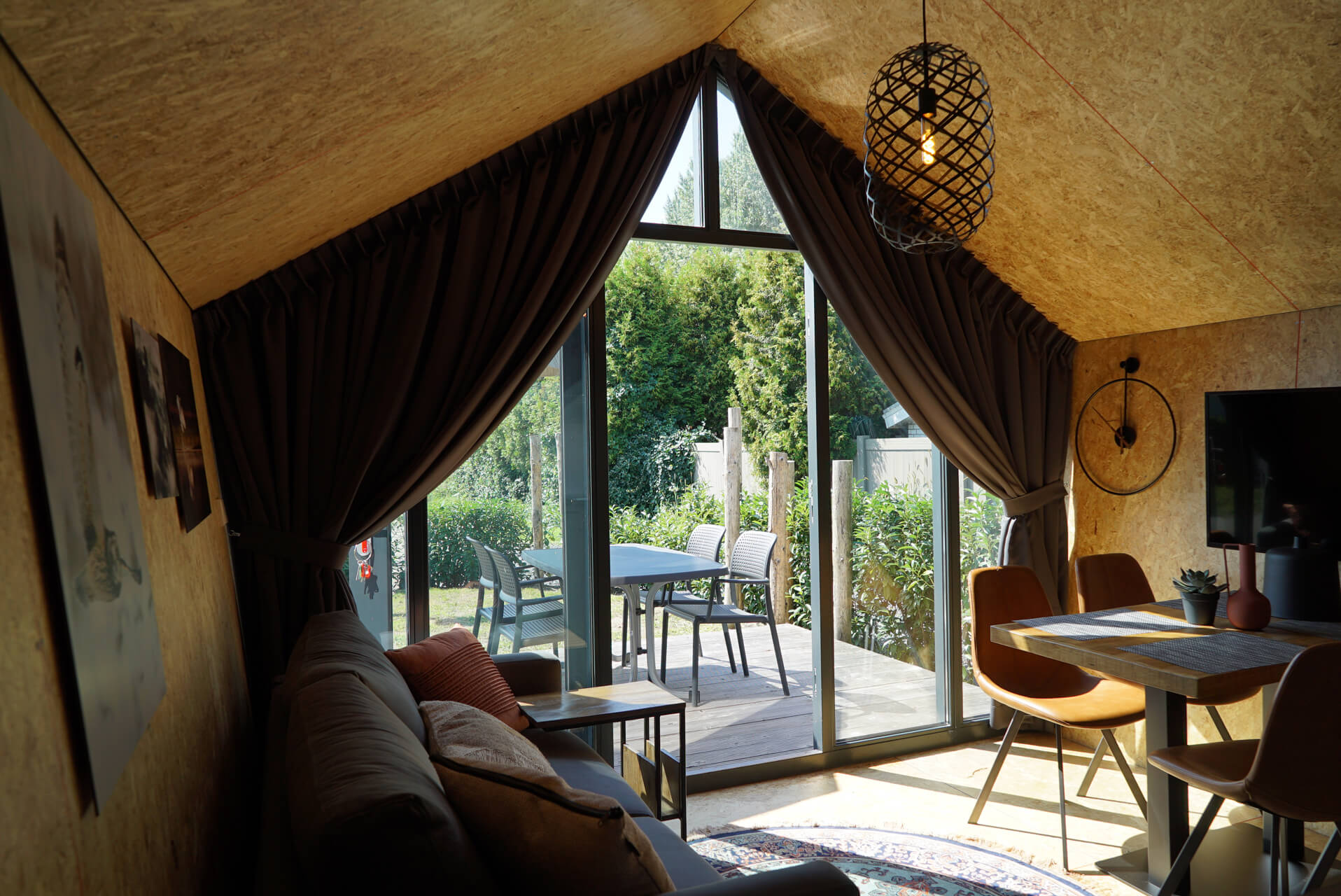 Solo Retreat - Das Ferienhaus Solo Retreat 4 bietet viel Komfort auf wenigen Quadratmetern. Das Chalet ist ebenerdig und kann bis zu 4 Personen beherbergen. Im modern eingerichteten Wohnbereich finden Sie eine Sitzecke mit Fernseher, einen Esstisch mit Stühlen und eine Küche, die mit einem Induktionskochfeld, Wasserkocher und Kaffeemaschine ausgestattet ist. Das Solo Retreat 4 verfügt über 2 Schlafzimmer mit 2 Einzelbetten und ein Badezimmer mit Regendusche, Waschbecken und Toilette.