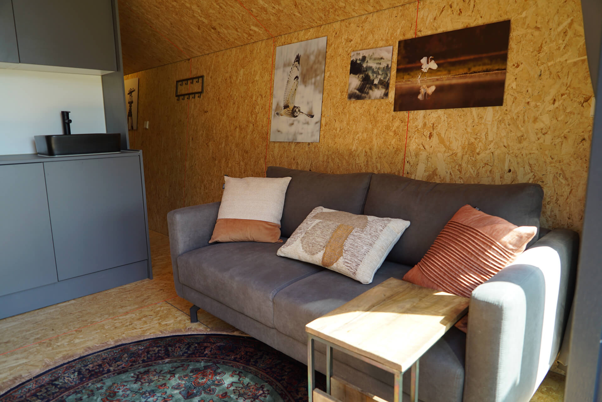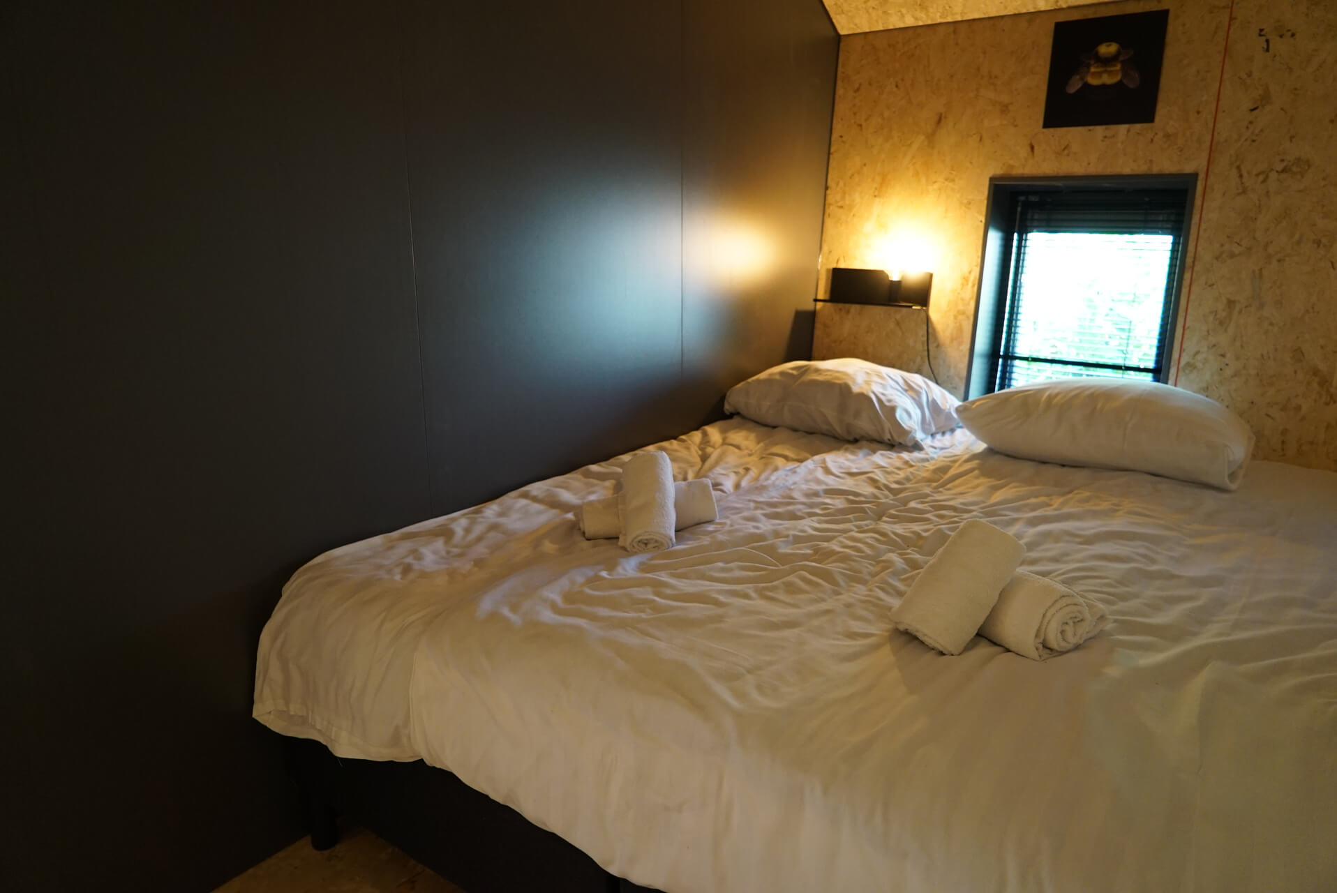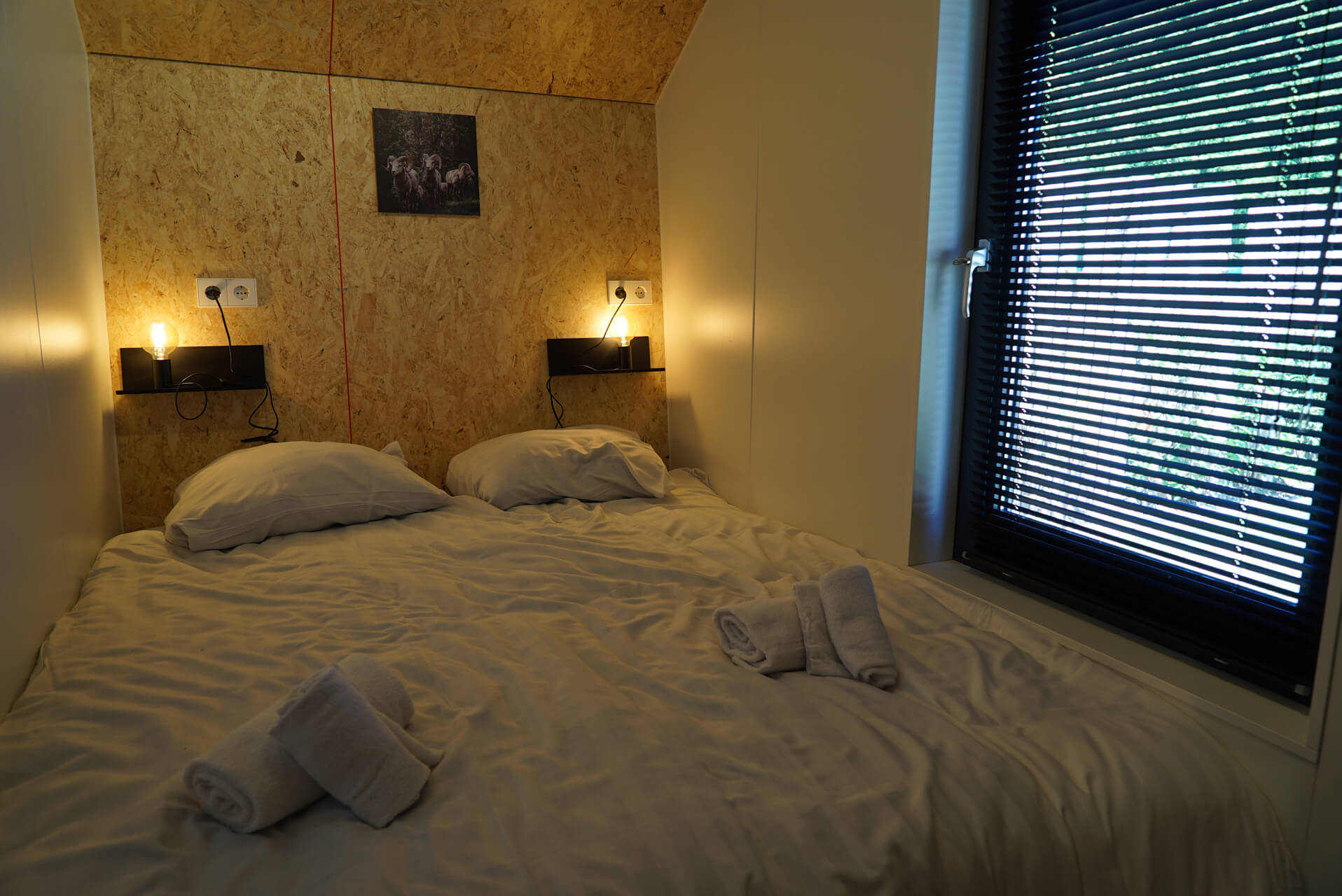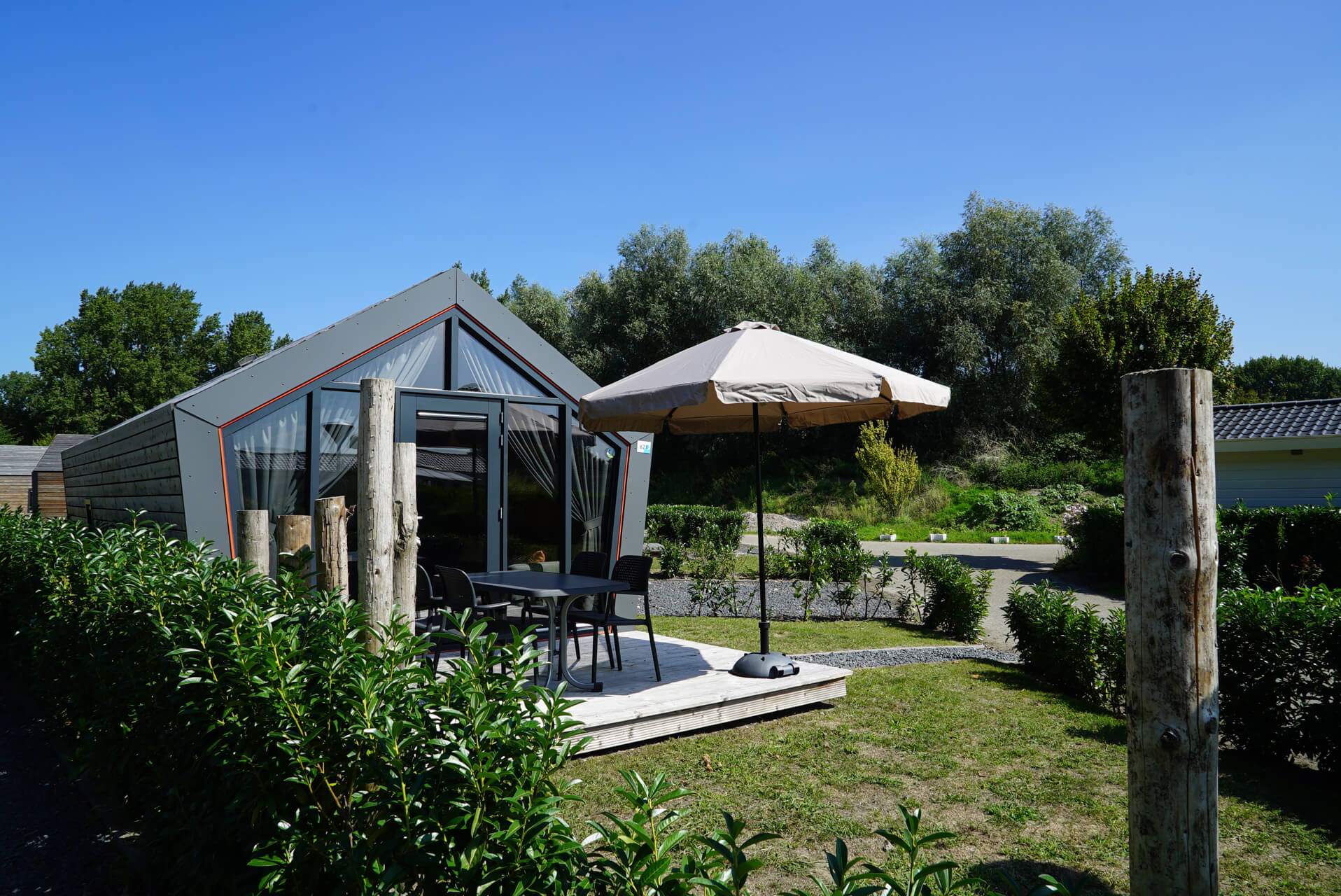 Solo Retreat - Das Ferienhaus Solo Retreat 4 bietet viel Komfort auf wenigen Quadratmetern. Das Chalet ist ebenerdig und kann bis zu 4 Personen beherbergen. Im modern eingerichteten Wohnbereich finden Sie eine Sitzecke mit Fernseher, einen Esstisch mit Stühlen und eine Küche, die mit einem Induktionskochfeld, Wasserkocher und Kaffeemaschine ausgestattet ist. Das Solo Retreat 4 verfügt über 2 Schlafzimmer mit 2 Einzelbetten und ein Badezimmer mit Regendusche, Waschbecken und Toilette.