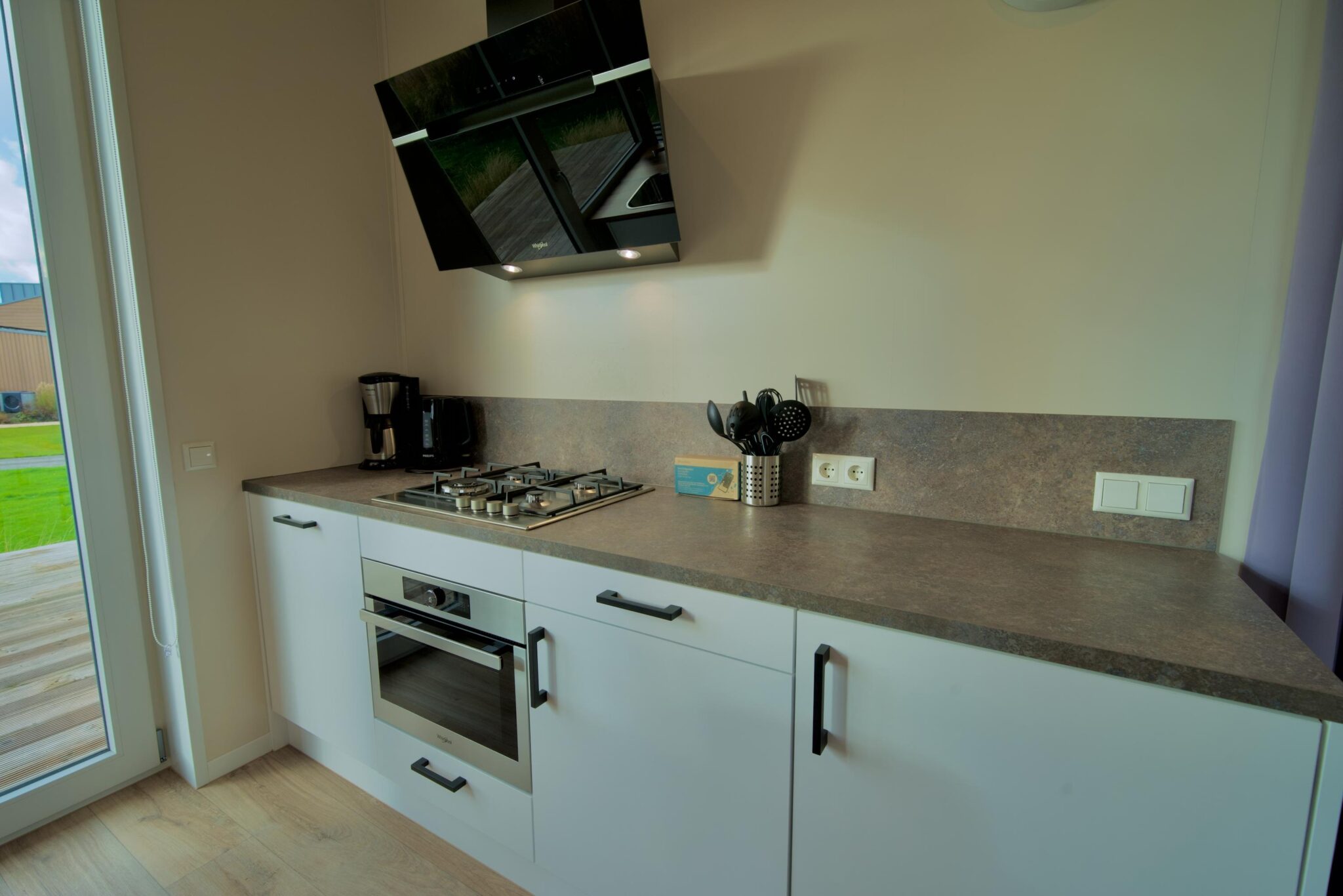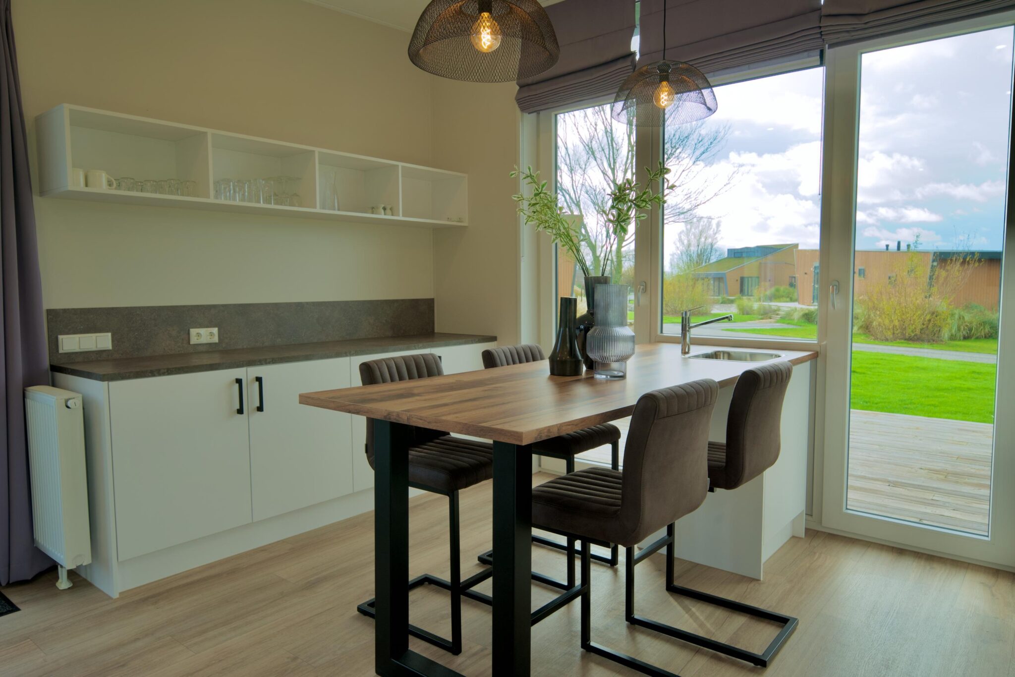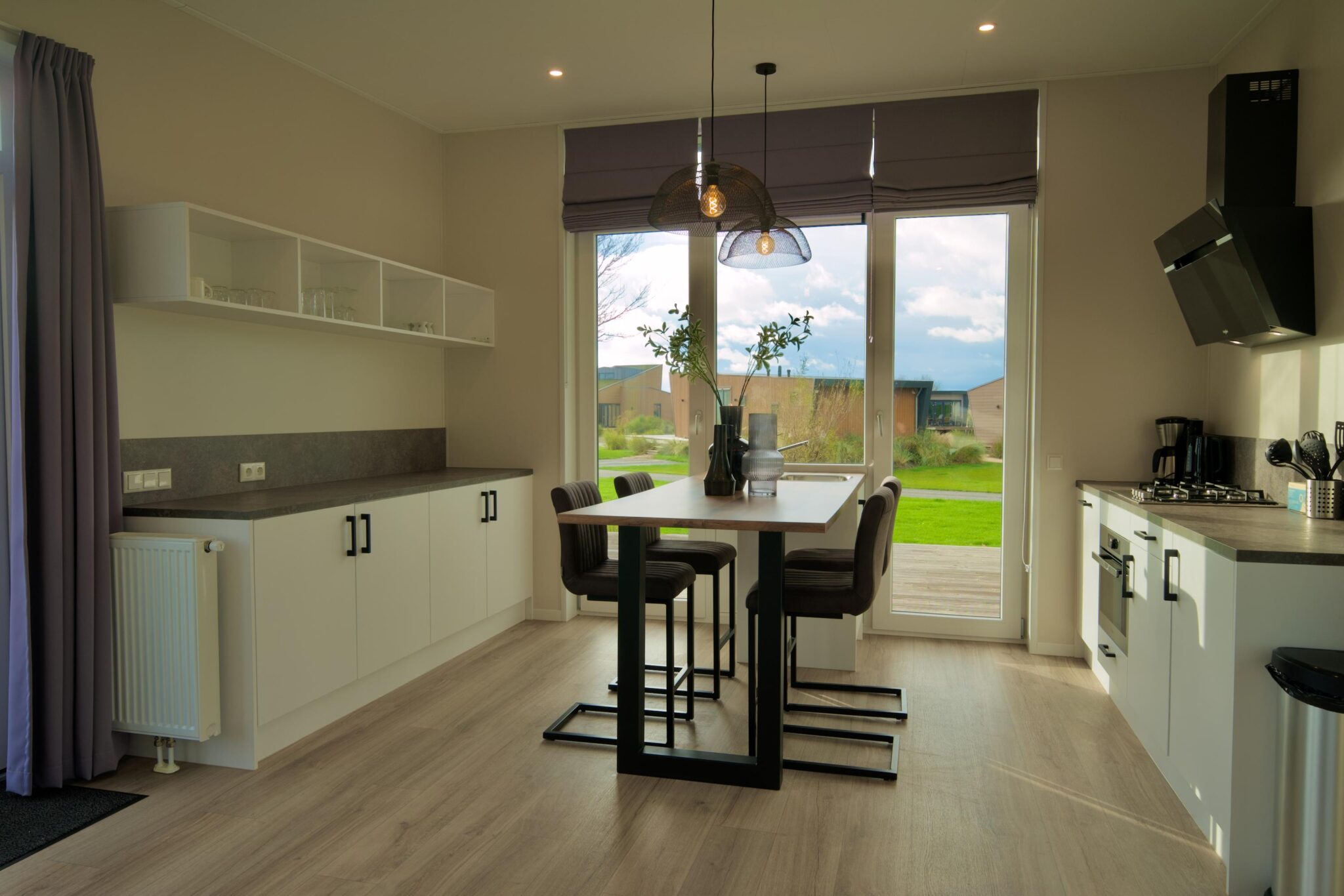 Just Nature 2.0 verfügt über zwei großzügige Schlafzimmer, eine voll ausgestattete Küche mit Spülinsel, ein schönes Badezimmer mit ebenerdiger Dusche sowie ein separates WC. Die offene Gestaltung des Wohnbereichs mit großen Fenstern sorgt für Helligkeit und eine einladende Atmosphäre, während die Terrassentüren in der Küche das Kochen fast zu einem Outdoor-Erlebnis machen.