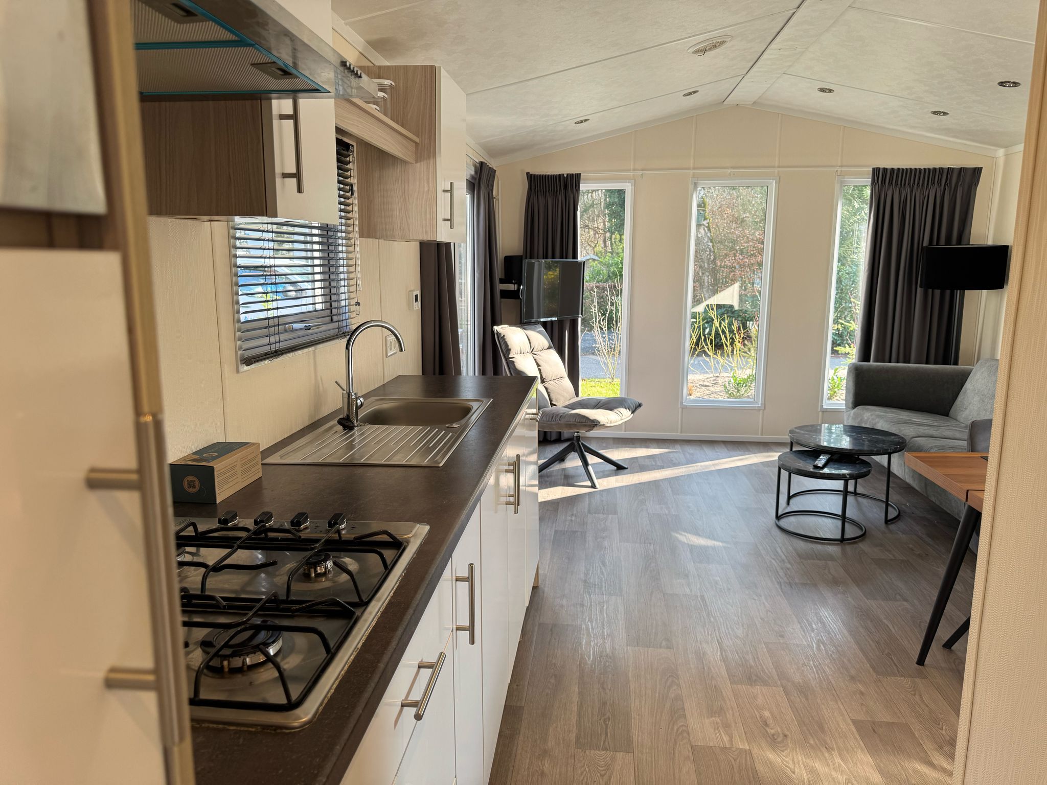 unique 4 - Dieses Ferienhaus steht für Komfort rundum. Die schöne Lage mit Blick auf den Garten sorgt für eine traumhafte Aussicht, aber auch das Haus selbst ist unverwechselbar. Sowohl innen als auch außen wurden pflegeleichte Materialien verwendet und das Haus ist vollständig isoliert und doppelt verglast. Durch die großen Fenster haben Sie jeden Tag einen schönen Blick ins Grüne und die Terrasse auf der Vorderseite des Ferienhauses bietet einen schönen Ort zum Entspannen.
