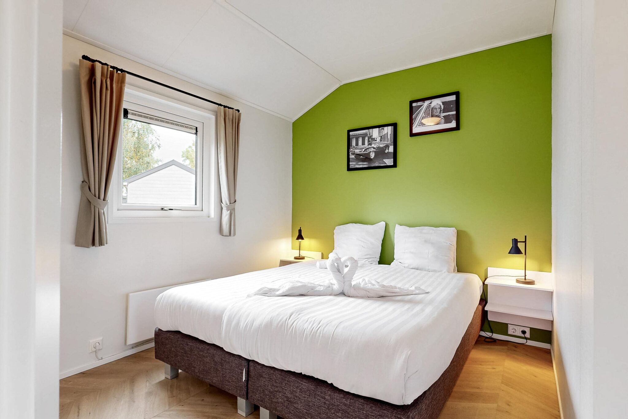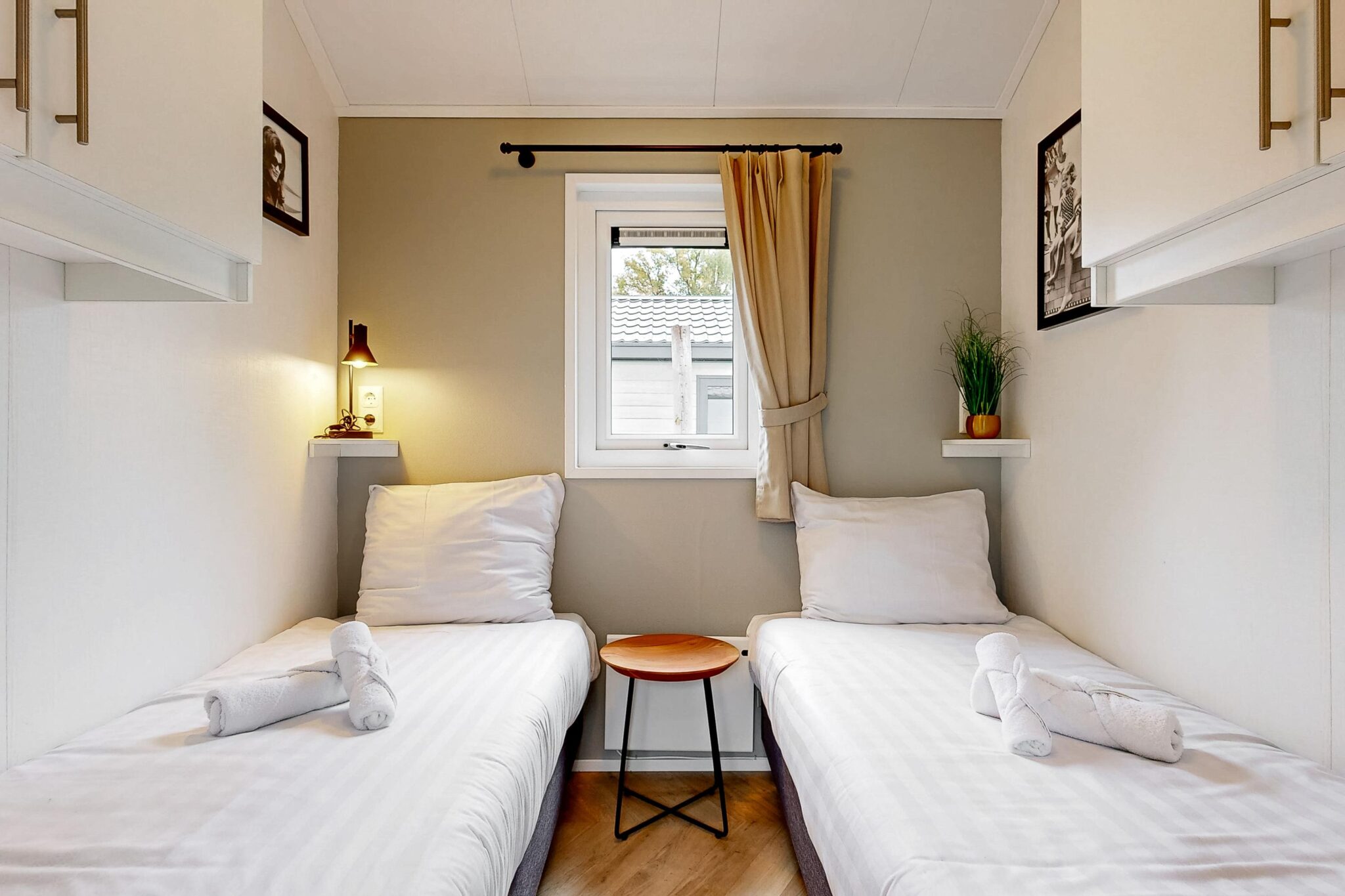 Es gibt 2 Schlafzimmer mit jeweils 2 Einzelbetten. Im Hauptschlafzimmer sind diese zu einem Doppelbett zusammengeschoben. Das Chalet verfügt auch über ein Badezimmer mit Dusche, Waschbecken und Toilette. Durch die Terrassentüren im Wohnzimmer gelangen Sie auf die Terrasse mit Gartenmöbeln. Zu dem Ferienhaus gehört ein Parkplatz.