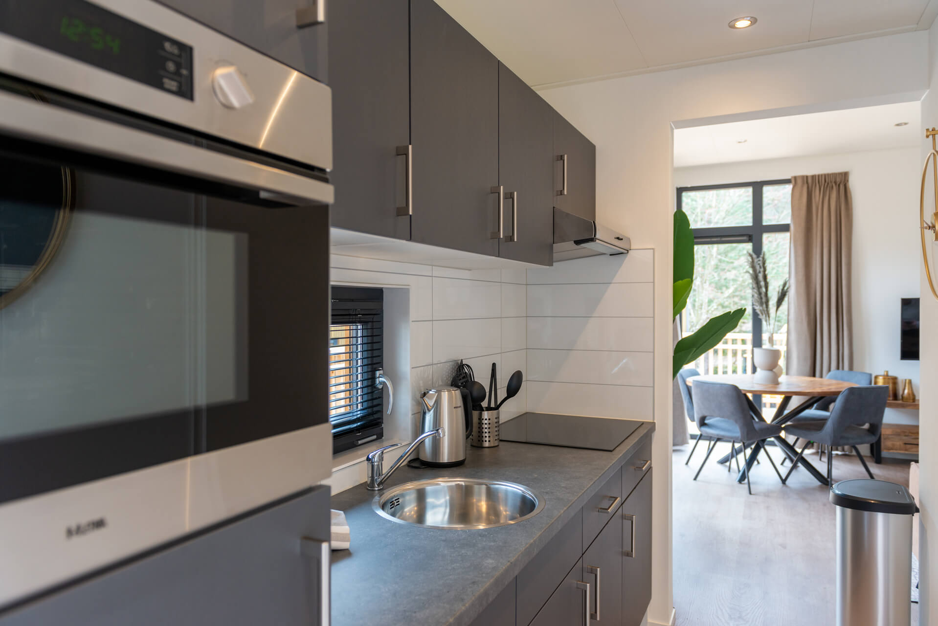 Die Holzoptik dieses Chalets fügt sich beinahe nahtlos in die waldreiche Umgebung ein. Im Inneren strahlt das Cube la Mer ein heimeliges Gefühl aus: Das Wohnzimmer ist mit einem runden Esstisch, bequemen Stühlen, einem TV-Schrank und dem Loungesofa gemütlich eingerichtet und ist direkt mit der Küche verbunden. So verbringt die Familie möglichst viel Zeit miteinander. Die Kochnische ist ebenfalls komplett mit Herd, Dunstabzugshaube, Edelstahlspüle, Kühl-Gefrierkombination, Mikrowelle und Geschirrspüler ausgestattet.
