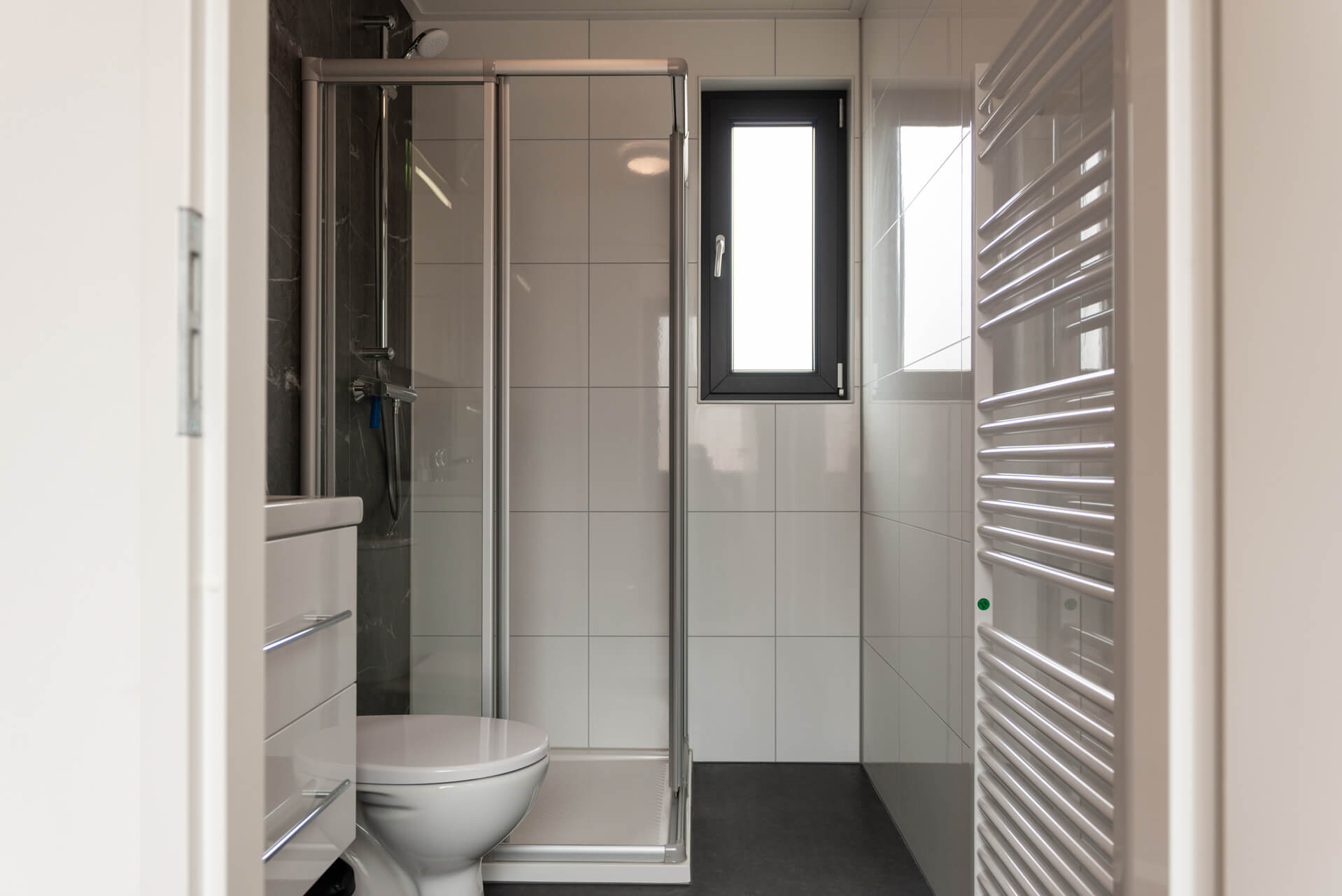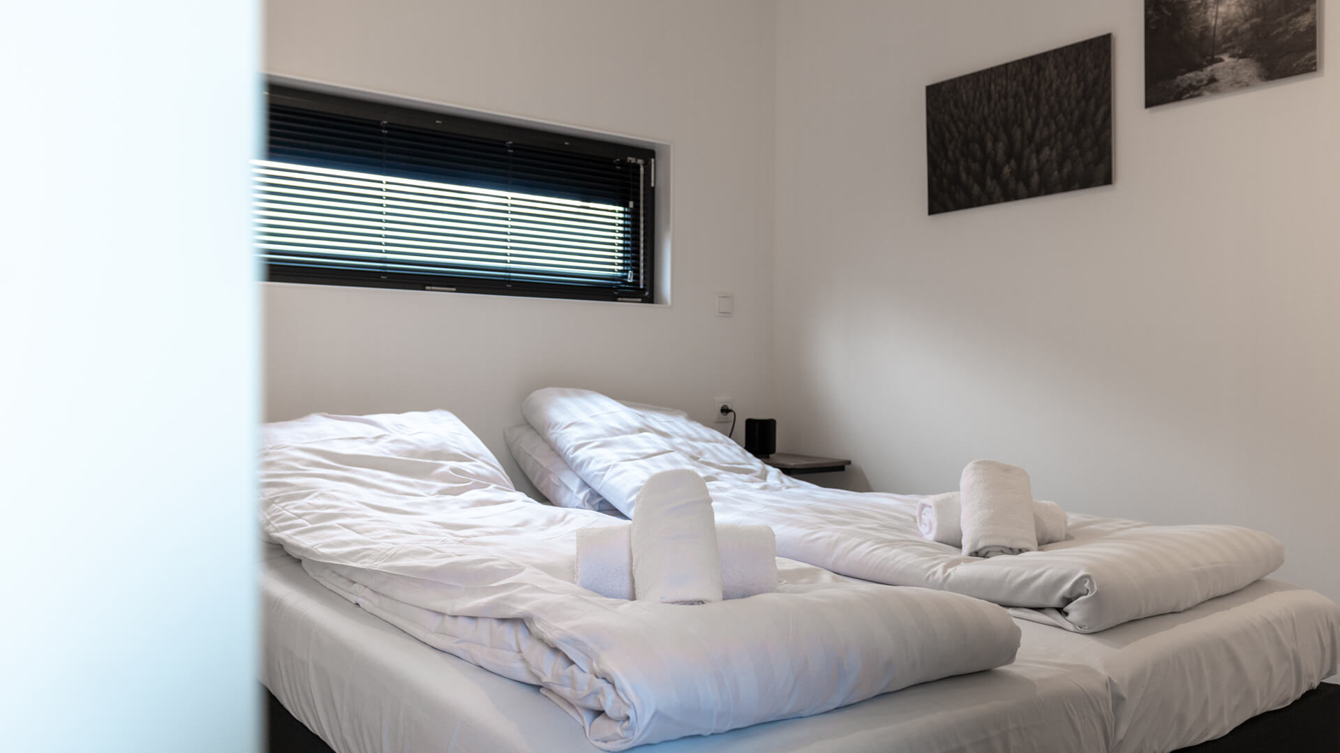 Neben der geräumigen Wohnküche verfügt das Cube la Mer über zwei Schlafzimmer: Eines mit Doppelbett und eines mit zwei Einzelbetten, zwischen denen ein Nachttisch steht. Das Badezimmer ist komplett gefliest und mit einer Duschkabine, einem Waschbecken mit Spiegel, einer Toilette und einem Design-Heizkörper ausgestattet.