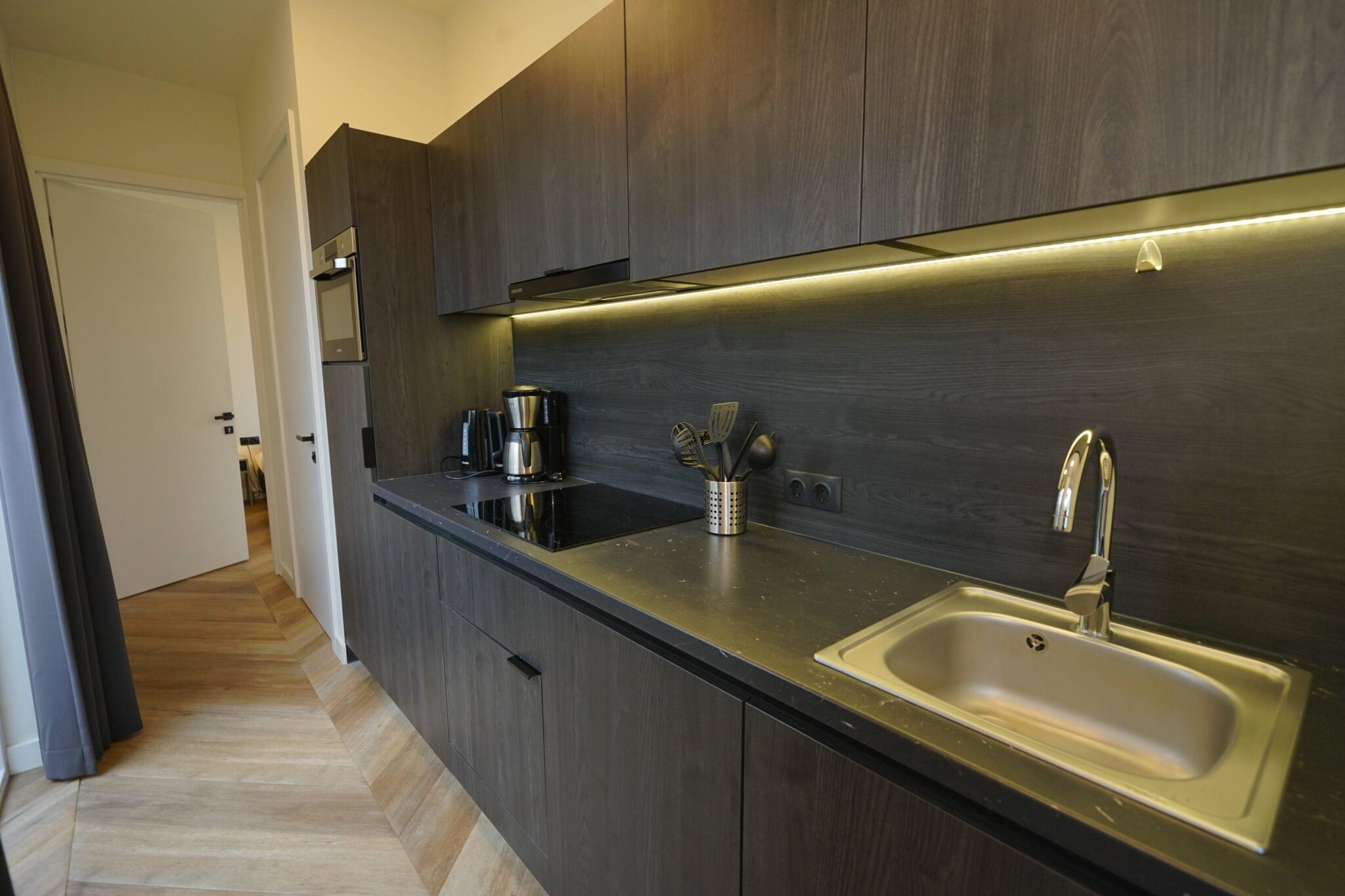 Das Wohnzimmer ist mit einer gemütlichen Sitzecke mit Fernseher und einer Essecke daneben eingerichtet. Die offene Küche ist unter anderem mit einem Geschirrspüler, einer Mikrowelle und einem Wasserkocher ausgestattet.
