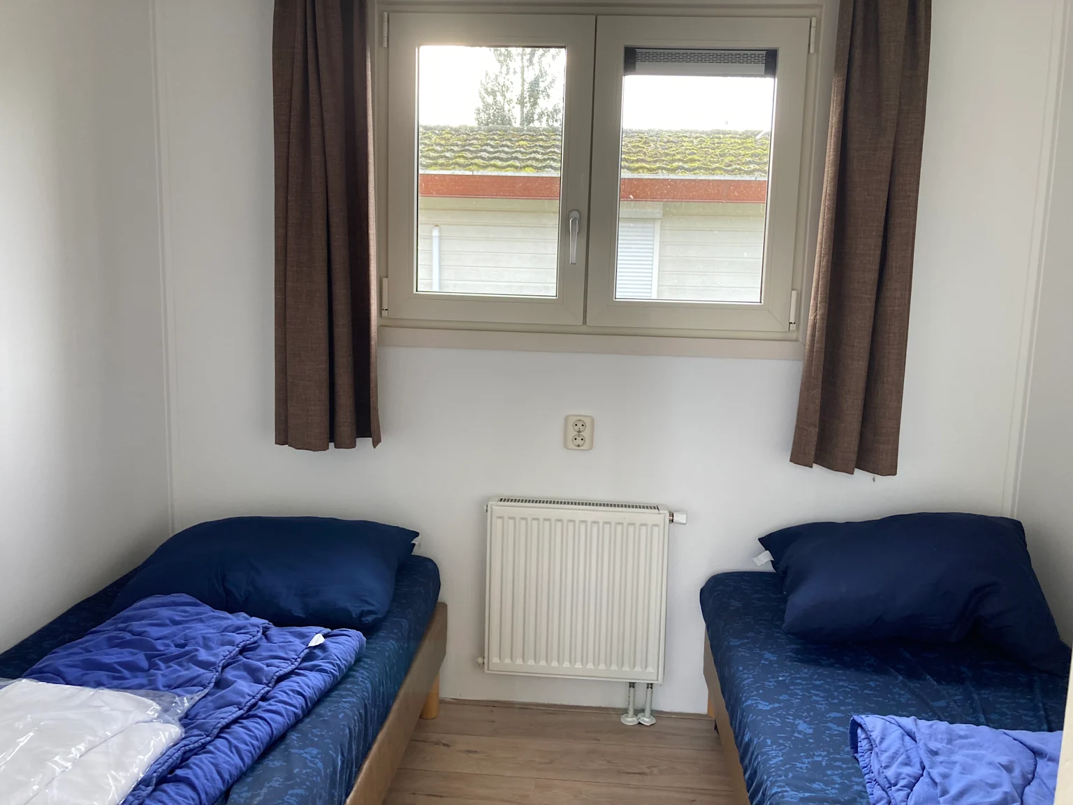 Es gibt 2 Schlafzimmer mit jeweils 2 Einzelbetten. Im Hauptschlafzimmer sind diese zu einem Doppelbett zusammengeschoben. Das Chalet verfügt auch über ein Badezimmer mit Dusche, Waschbecken und Toilette. Durch die Terrassentüren im Wohnzimmer gelangen Sie auf die Terrasse mit Gartenmöbeln.