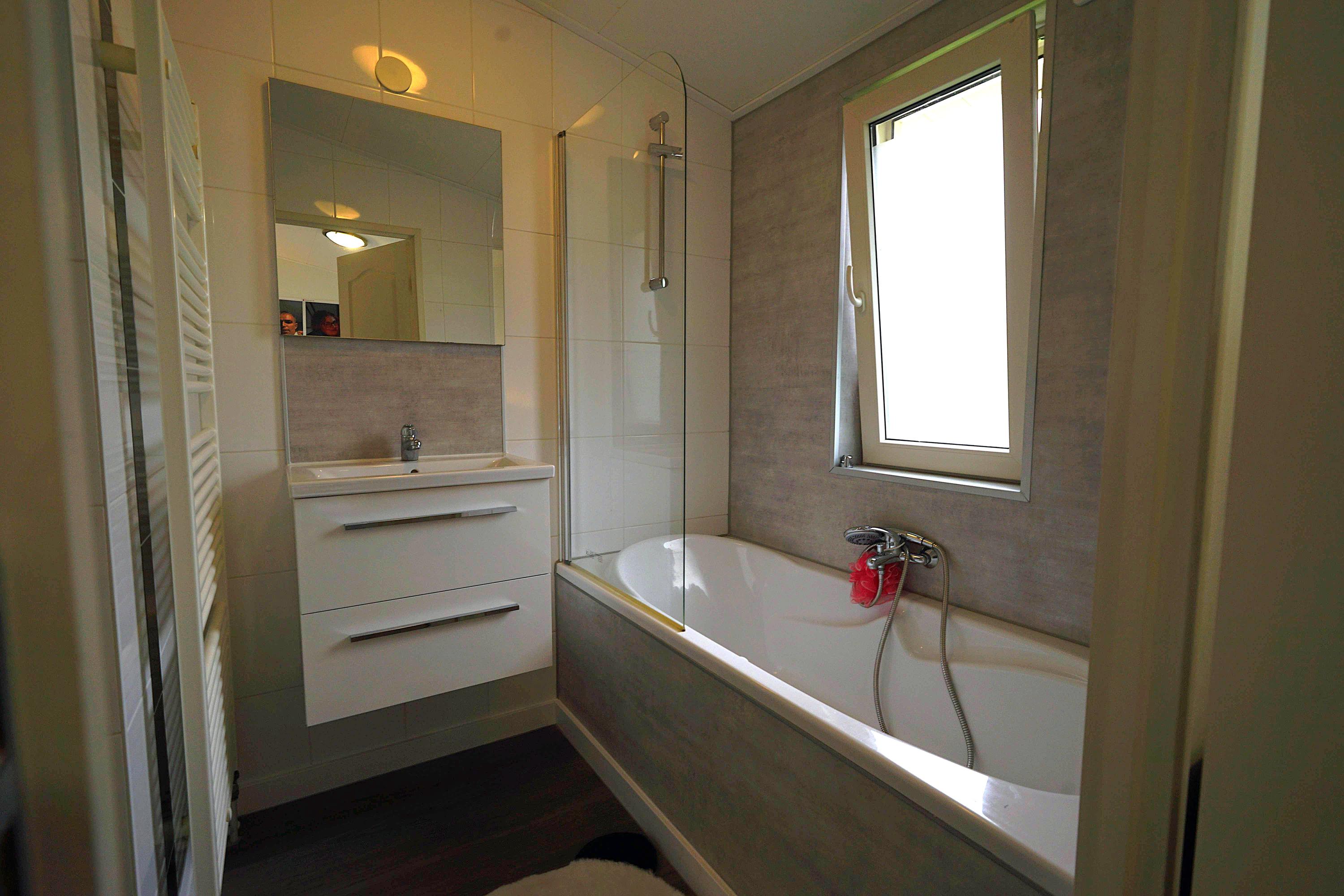 Das moderne Badezimmer ist vollständig gefliest und verfügt über eine Duschkabine, einen Designheizkörper, ein WC sowie ein Waschbecken mit Spiegel. Zusätzlich gibt es ein separates WC.