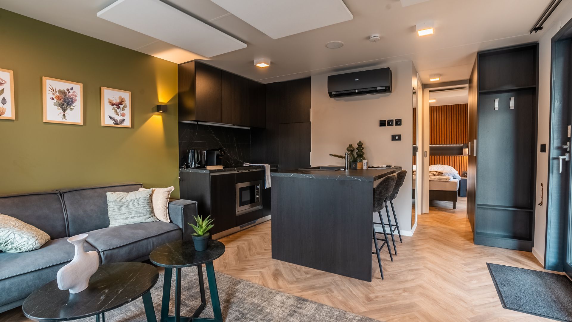 Das Wohnzimmer kann ebenfalls als geräumig bezeichnet werden, mit einem großzügigen Sitz- und Loungebereich und einer schönen offenen Küche mit Kochinsel. Diese Küche verfügt über eine Edelstahlspüle, einen Geschirrspüler, einen eingebauten Kühl- und Gefrierschrank, eine eingebaute Mikrowelle und einen Ofen sowie einen Dunstabzug über dem Kochfeld. Eine schöne Garderobe im Flur zwischen dem Schlafzimmer und dem Wohnzimmer bestätigt einladenden Gesamteindruck dieser Ferienunterkunft. Auf der anderen Seite der Garderobe befindet sich das Bad, das mit einer geräumigen Dusche, einer Toilette, einem Waschbecken und Spiegel ausgestattet ist.