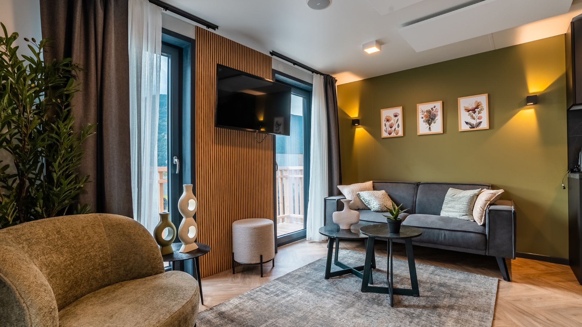 Seerose - Diese 9 Meter lange, 4,5 Meter breite und 3,5 Meter hohe Ferienunterkunft sieht aus wie ein Zuhause und fühlt sich auch so an. Die Farbe Anthrazit unterstreicht das hochwertige Erscheinungsbild dieses 2-Personen-Mobilheims ebenso wie die Elemente in Holzoptik, die zur waldreichen Umgebung passen. Die Terrasse, die Sie dank der Schiebetüren direkt vom Wohnzimmer aus betreten, garantiert zudem einen schönen Blick auf den Ossiacher See und die umliegenden Berghänge. Diese Terrasse, die um die Ferienunterkunft herum gebaut ist, besteht aus imprägniertem Kiefernholz.