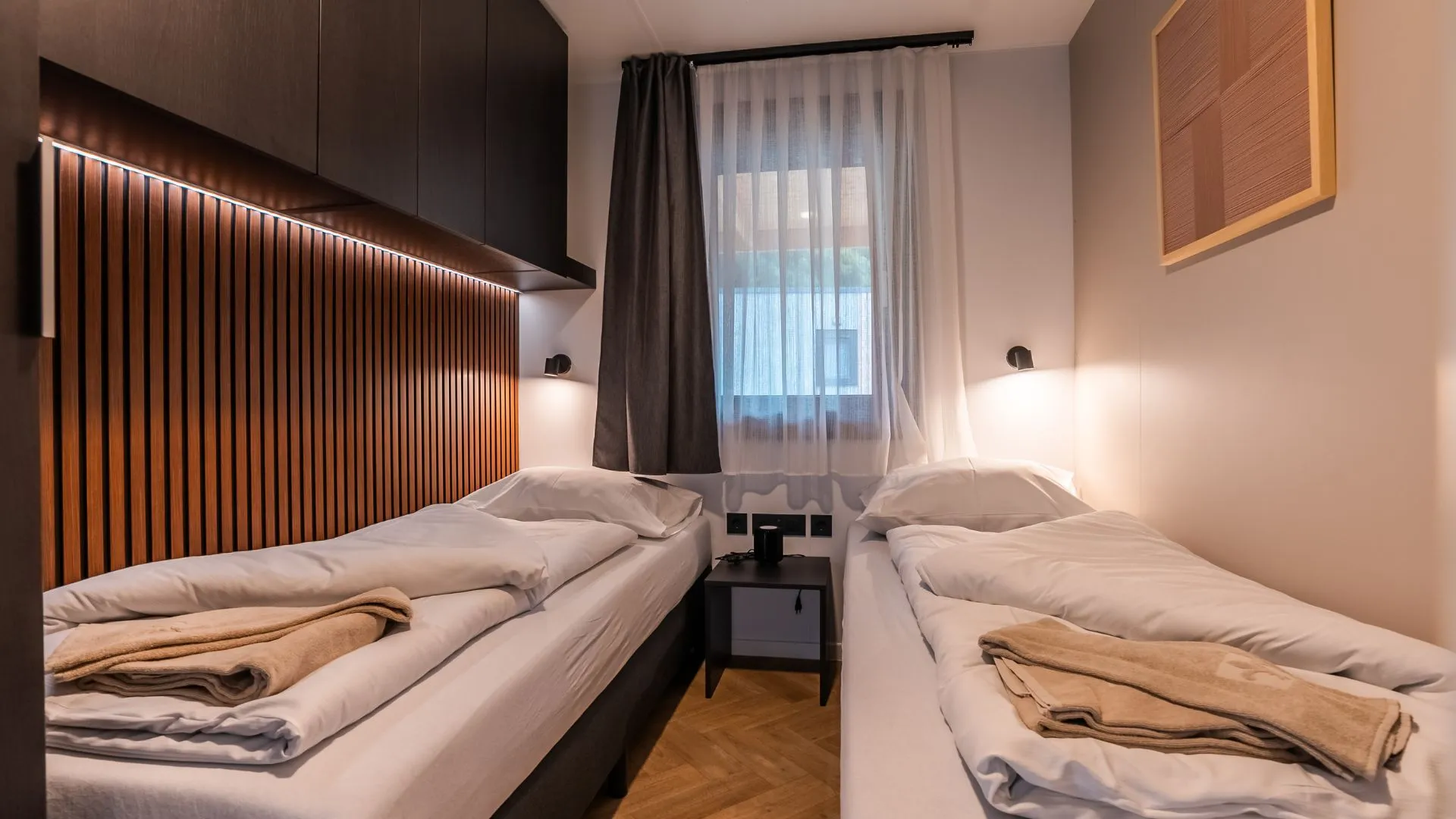 Beim Betreten des Mobilheims fällt der Blick auf das Schlafzimmer, das nicht nur großzügig bemessen, sondern auch mit zwei Schränken neben dem Doppelbett ausgestattet ist. Hängeschränke, ein Spiegel und Garderobenhaken sorgen für zusätzlichen Komfort. Durch eine Eingangstür gelangt man direkt auf die Terrasse. Das zweite und dritte Schlafzimmer sind jeweils mit zwei Einzelbetten und einem Nachttisch dazwischen ausgestattet. Ein Kleiderschrank, Hängeschränke und Kleiderhaken geben diesen Räumen zusätzlichen Stauraum und eine persönliche Note.