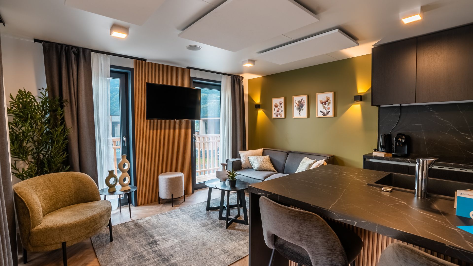 Seerose - Diese 9 Meter lange, 4,5 Meter breite und 3,5 Meter hohe Ferienunterkunft sieht aus wie ein Zuhause und fühlt sich auch so an. Die Farbe Anthrazit unterstreicht das hochwertige Erscheinungsbild dieses 2-Personen-Mobilheims ebenso wie die Elemente in Holzoptik, die zur waldreichen Umgebung passen. Die Terrasse, die Sie dank der Schiebetüren direkt vom Wohnzimmer aus betreten, garantiert zudem einen schönen Blick auf den Ossiacher See und die umliegenden Berghänge. Diese Terrasse, die um die Ferienunterkunft herum gebaut ist, besteht aus imprägniertem Kiefernholz.