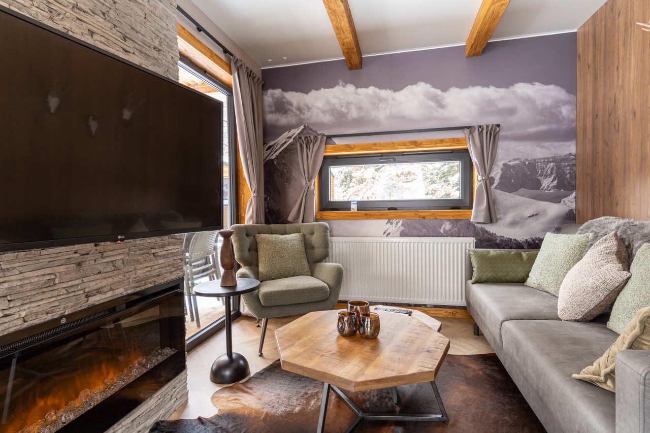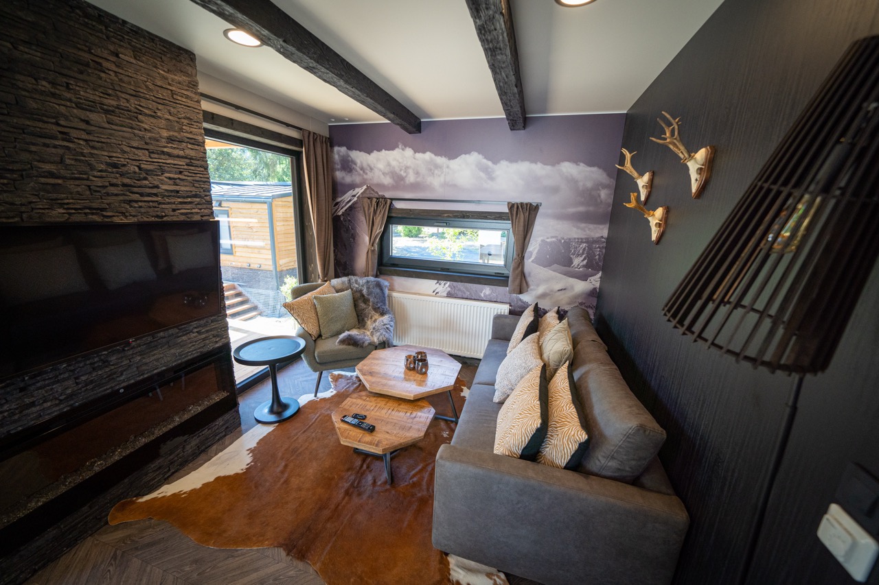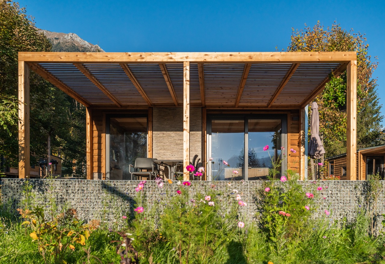 Panorama Lodge 6 - Diese Ferienunterkunft für 6 Personen fällt sofort ins Auge durch seine solide Architektur, die schöne, von einer Pergola überdachten Terrasse und den Panoramablick auf die umliegenden Berge. Das Haus verfügt über einen gemütlichen Empfangsraum mit einem Badezimmer auf der rechten Seite. Letzteres ist ausgestattet mit einem großen Waschbecken, einem WC und einer schönen begehbaren Dusche.