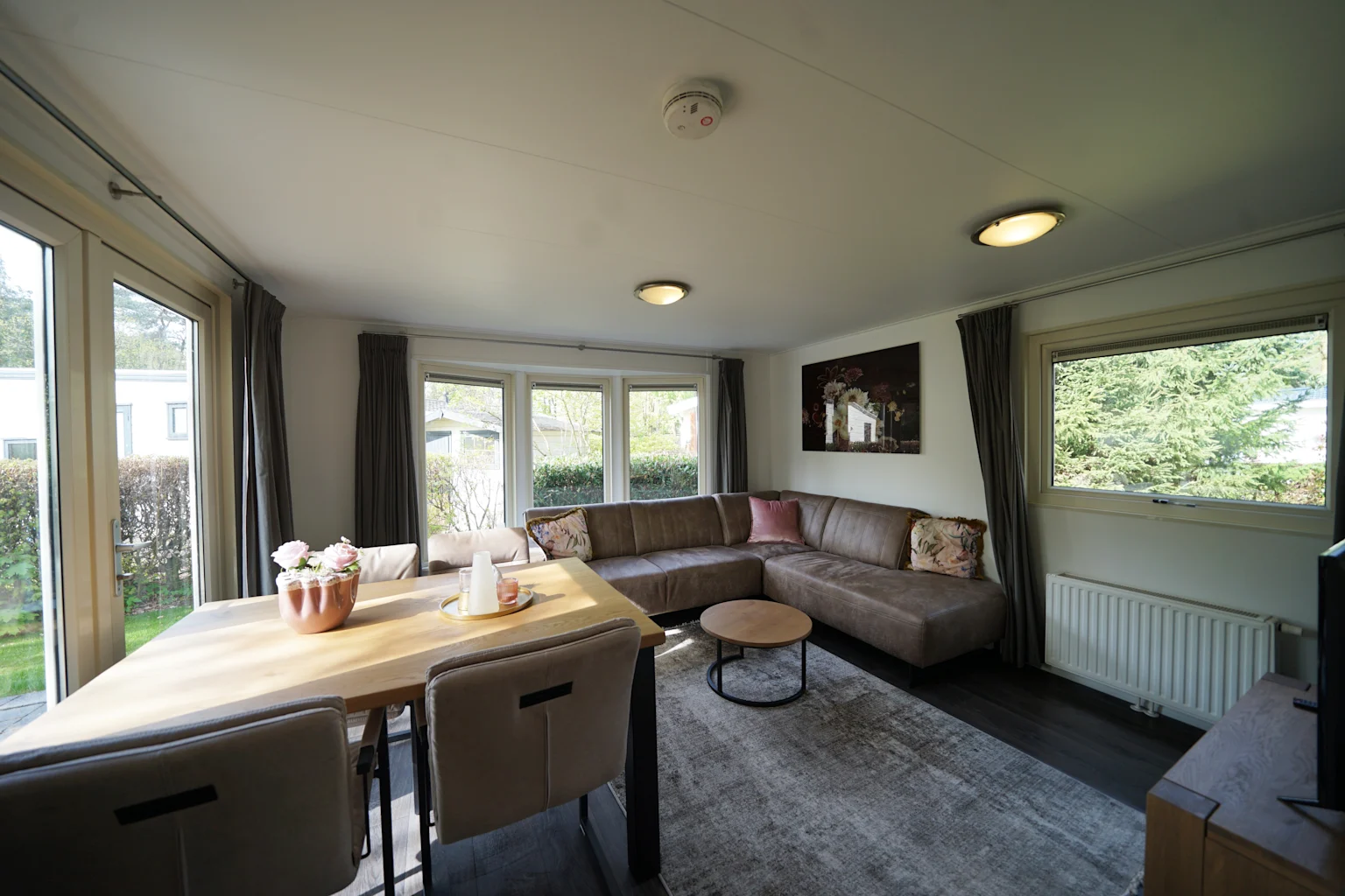 Sowohl innen als auch außen sind pflegeleichte Materialien verwendet worden. Außerdem ist das Ferienhaus vollständig isoliert und doppelt verglast. Der Wohnbereich ist mit großen Fenstern ausgestattet, durch die Sie eine schöne Aussicht ins Grüne haben. Genießen Sie hier oder auf der Terrasse im Garten eine Tasse Kaffee und beobachten Sie den Sonnenaufgang.