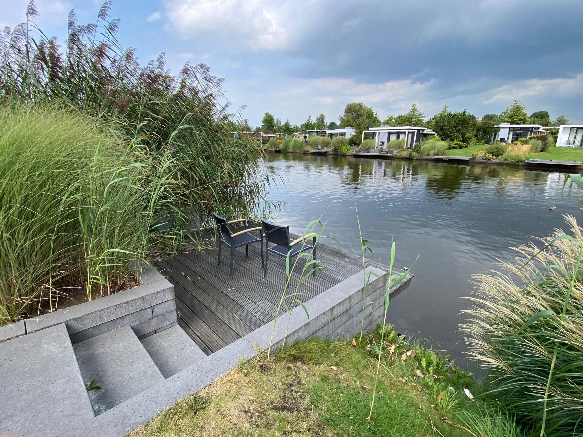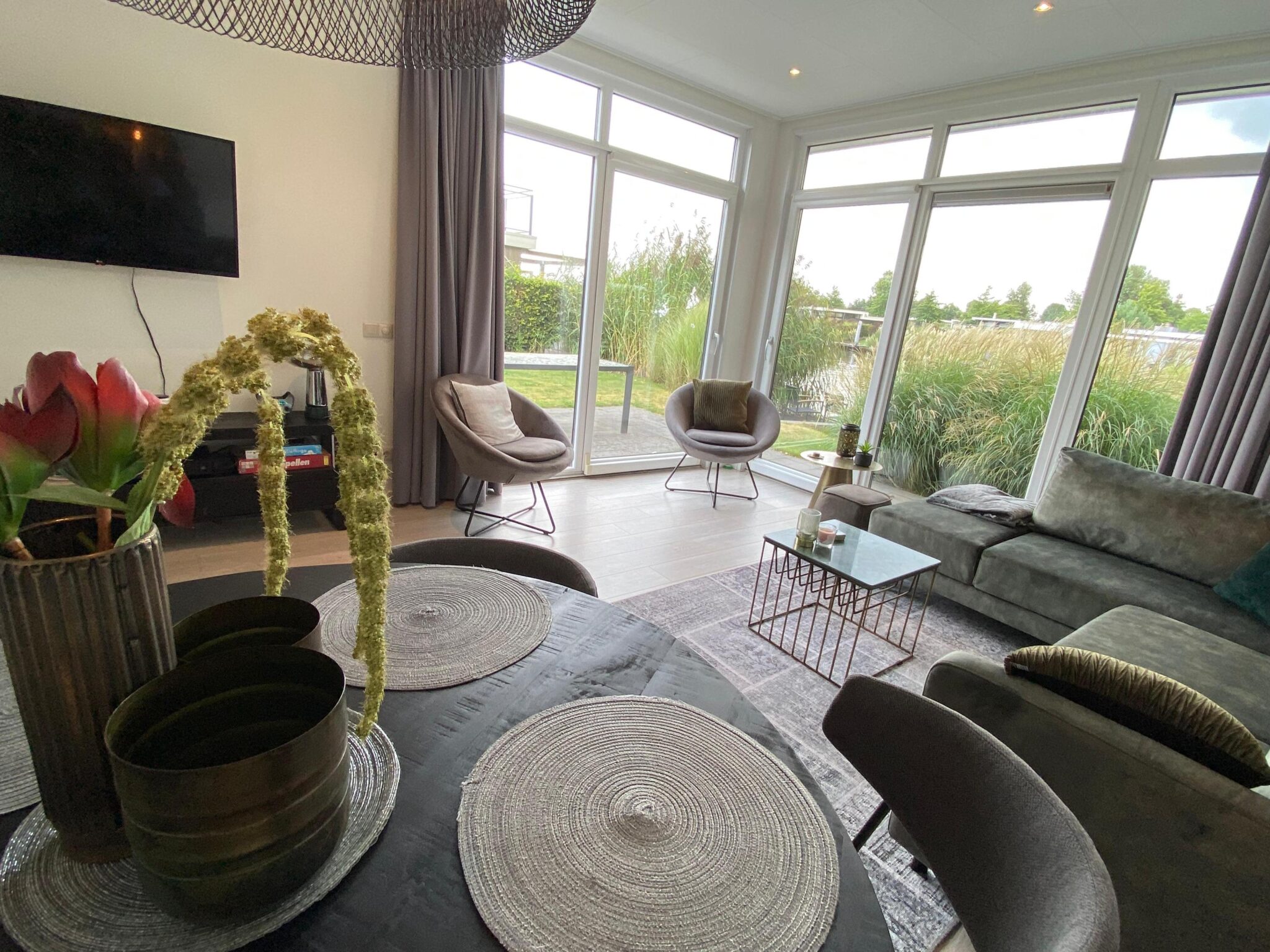 Vom Wohnzimmer aus gelangen Sie auf die Terrasse und in den Garten mit schönem Blick auf das Wasser.