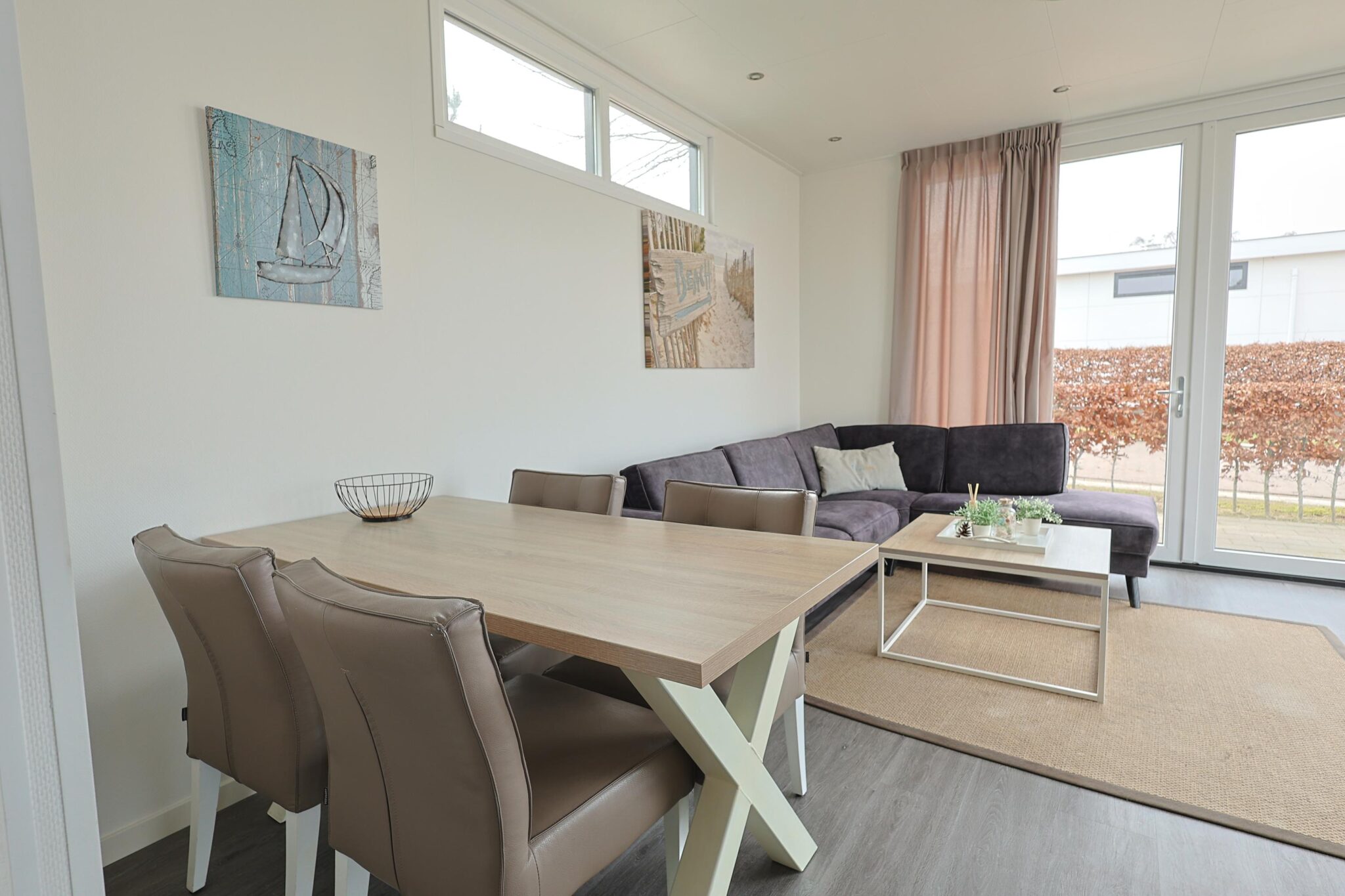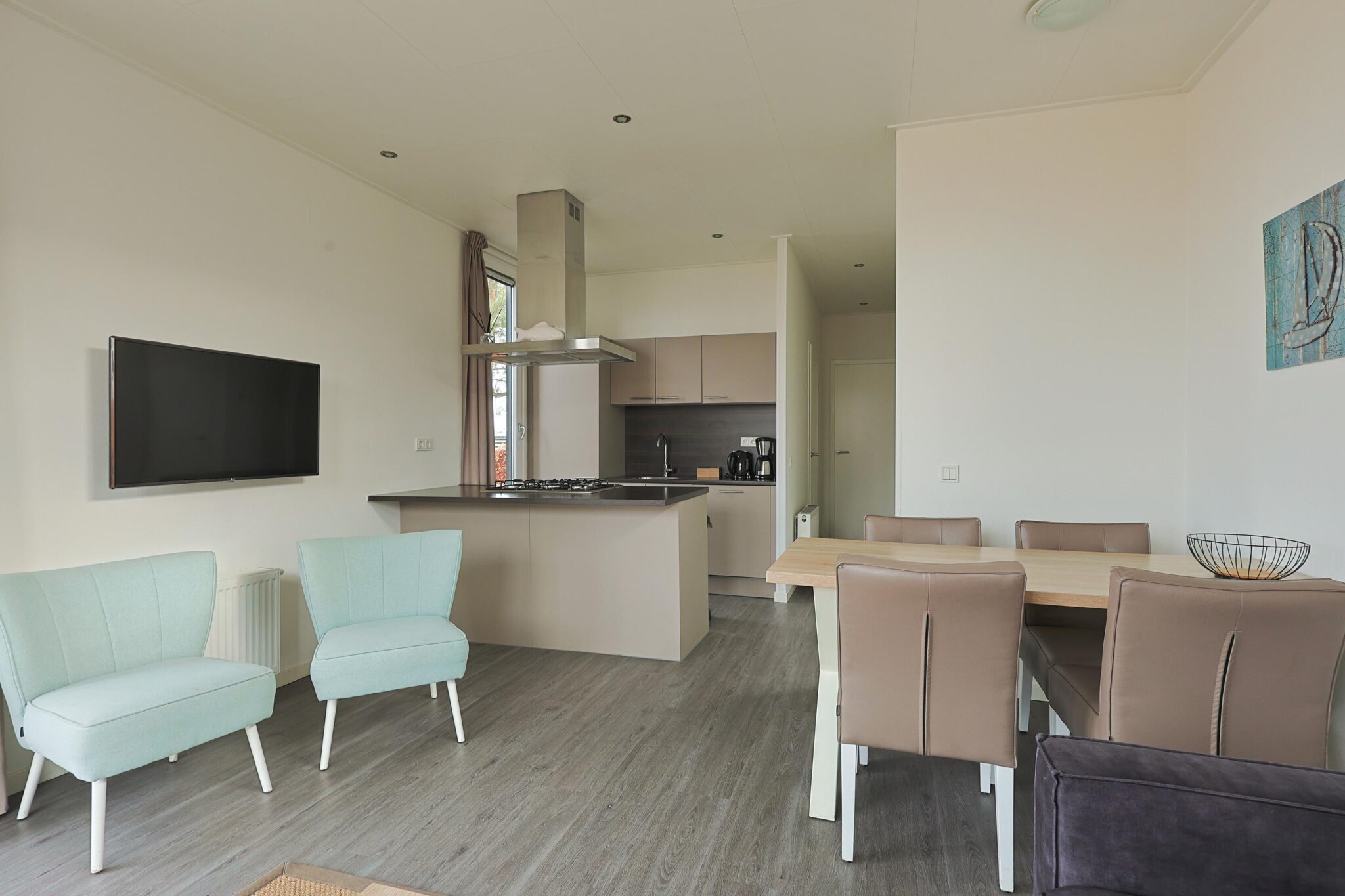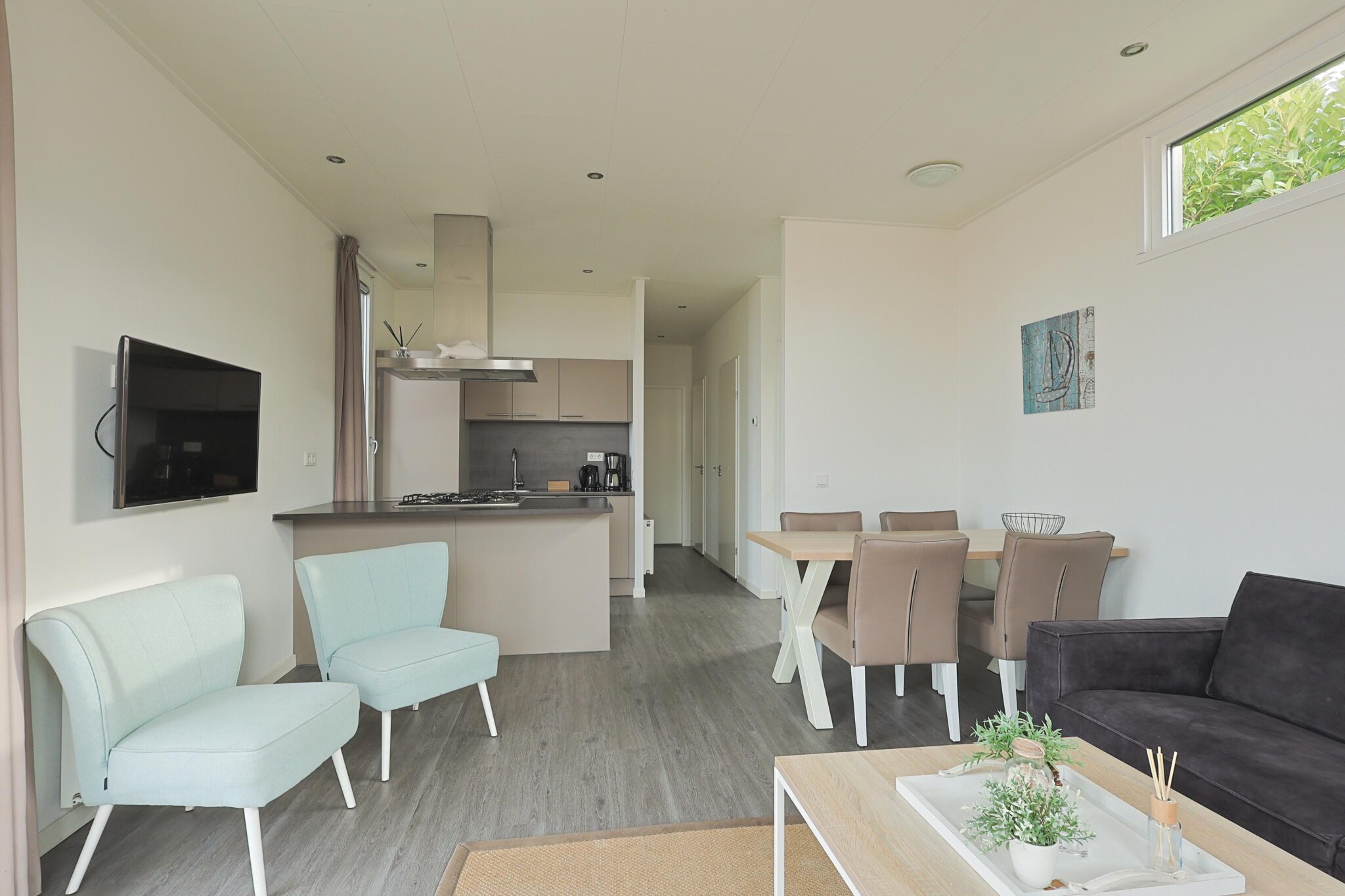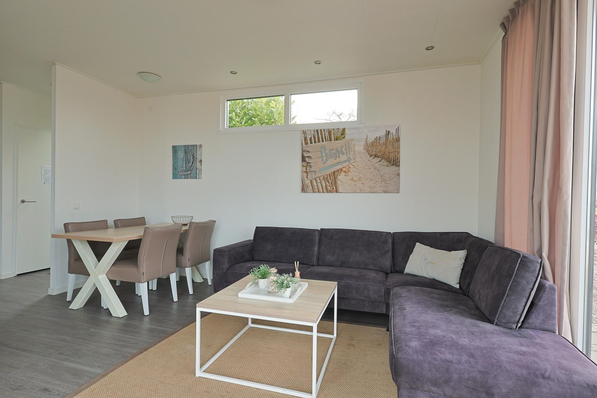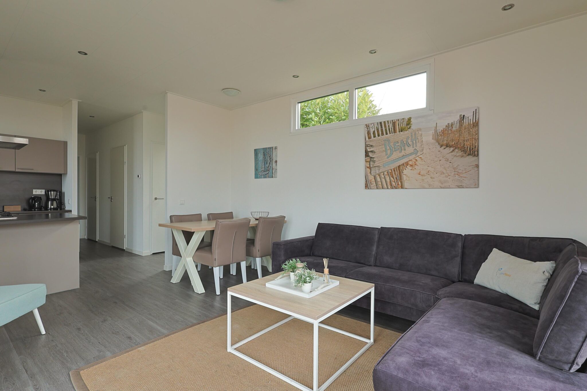 Wenn man das Ferienhaus betritt, kommt man direkt in das geräumige Wohnzimmer mit offener Küche. Diese ist mit allem nötigen Zubehör ausgestattet. Durch die großen Fenster im Wohnbereich hat man zudem eine schöne Aussicht auf die Terrasse und den Garten.