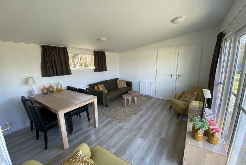 Pavilon Mystique - Der Haustyp 'Pavillon Mystique' ist geräumig, komfortabel und bietet ein optimales Preis-Leistungs-Verhältnis. Er ist wartungsarm und komplett mit langlebigen Materialien ausgestattet, was ihm ein attraktives und hochwertiges Aussehen verleiht. Warme Farbtöne geben dem Haus einen einladenden und gemütlichen Charakter. Der 'Pavillon Mystique' hat zwei Schlafzimmer und bietet Platz für bis zu 4 Personen. Darüber hinaus verfügt das Haus über einen hellen Wohnbereich, eine praktische Küche mit hochwertigen Einbaugeräten und ein modernes Badezimmer mit Dusche und WC. Vom Wohnzimmer aus erreichen Sie die geflieste Terrasse und das Gartengrundstück.