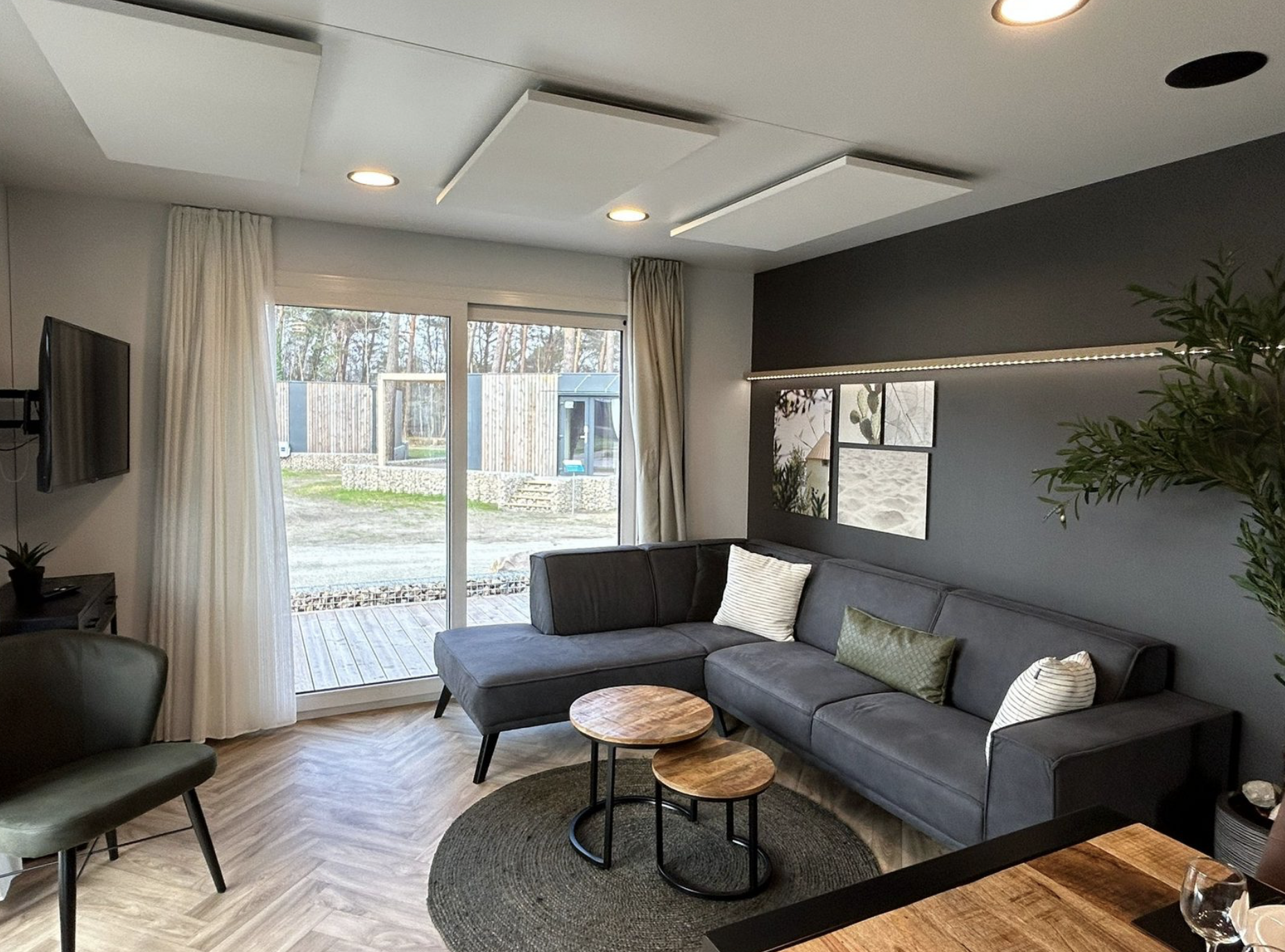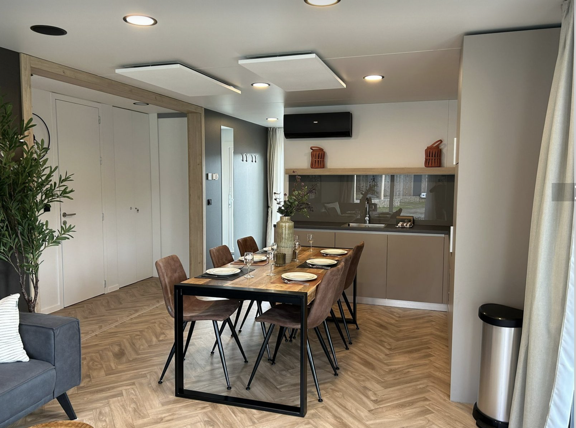 De lichte woonkamer vormt het hart van het chalet en is ingericht met een comfortabele zithoek met Smart TV en airconditioning, een gezellige eethoek en een complete open keuken. Hier beschik je over onder andere een vaatwasser, combimagnetron, waterkoker, koelkast met vriesvak en een filterkoffiezetapparaat — ideaal voor een ontspannen verblijf.
