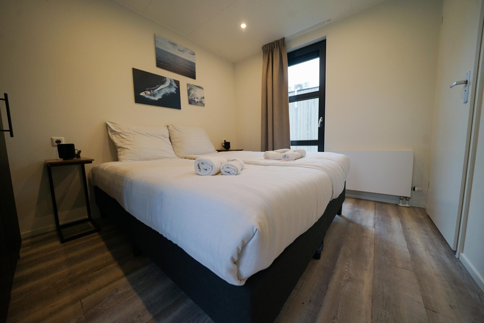 Cube maximaal 4 - Der Cube Maximaal 4 ist bekannt für sein modernes und schlankes Design. Dank der 3 Meter hohen Decken und der großen Fenster erlebt man hier Geräumigkeit pur. Das freistehende, ebenerdige Chalet ist für 4 Personen geeignet. Der Wohnbereich verfügt über eine Sitzecke mit Fernseher, eine Essecke und eine gut ausgestattete Küche mit Kombi-Mikrowelle, Geschirrspüler und einer Senseo Maschine. Das Chalet hat 2 Schlafzimmer mit je 2 Einzelbetten. Das Badezimmer ist mit einer Dusche und einem Waschbecken ausgestattet und es gibt eine separate Toilette in einem anderen Raum. Draußen kann man die große möblierte Terrasse genießen, die einen wunderschönen Ausblick auf die Umgebung bietet. Direkt beim Chalet gibt es einen Parkplatz für das eigene Auto. Die Nutzung des WLANs im Haus ist kostenlos.