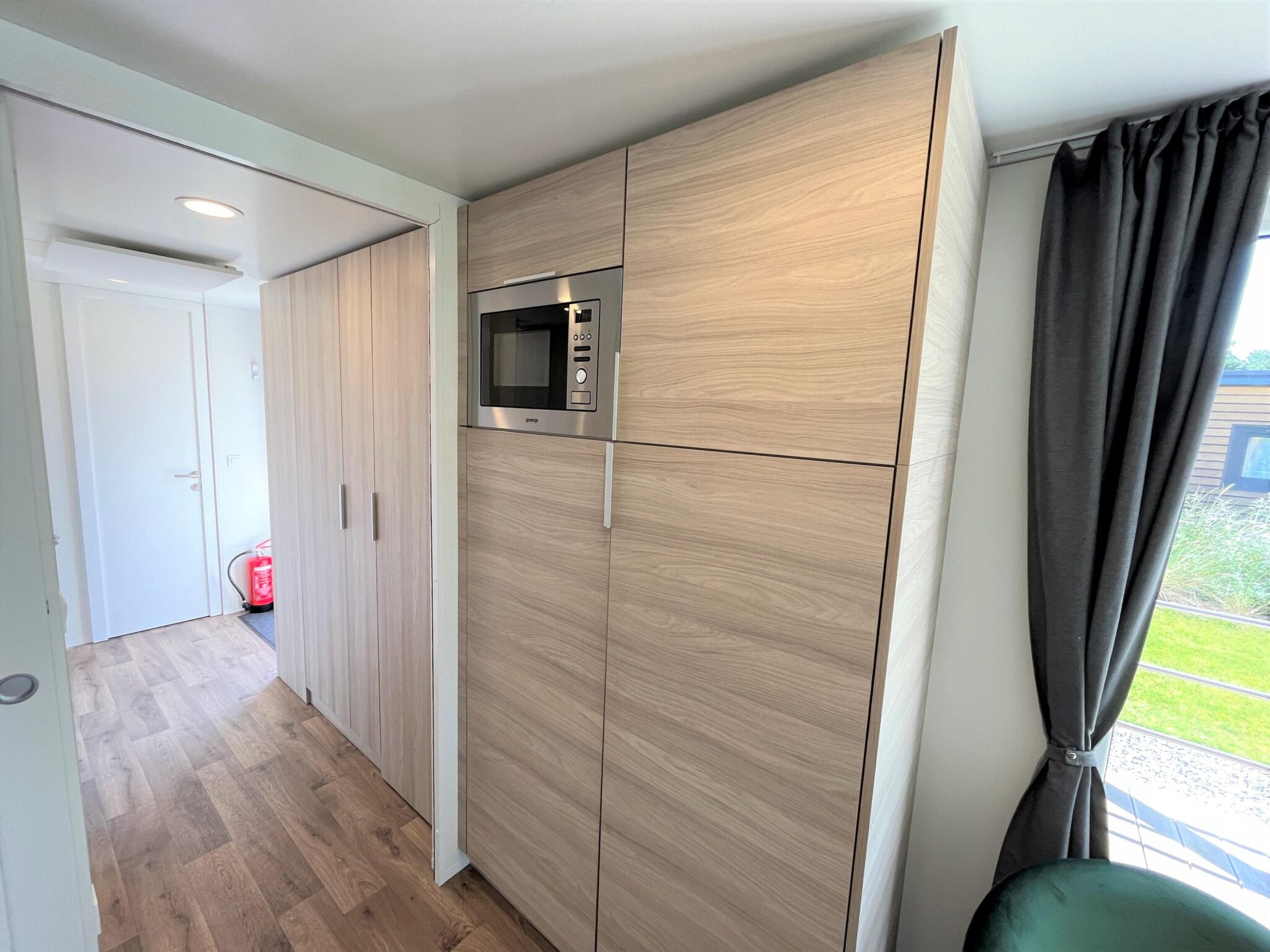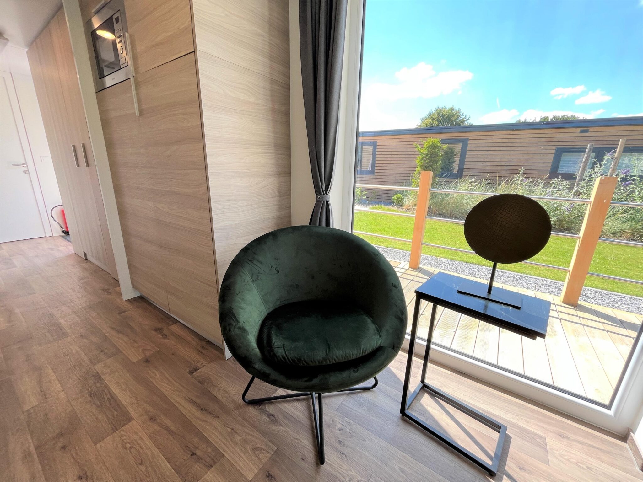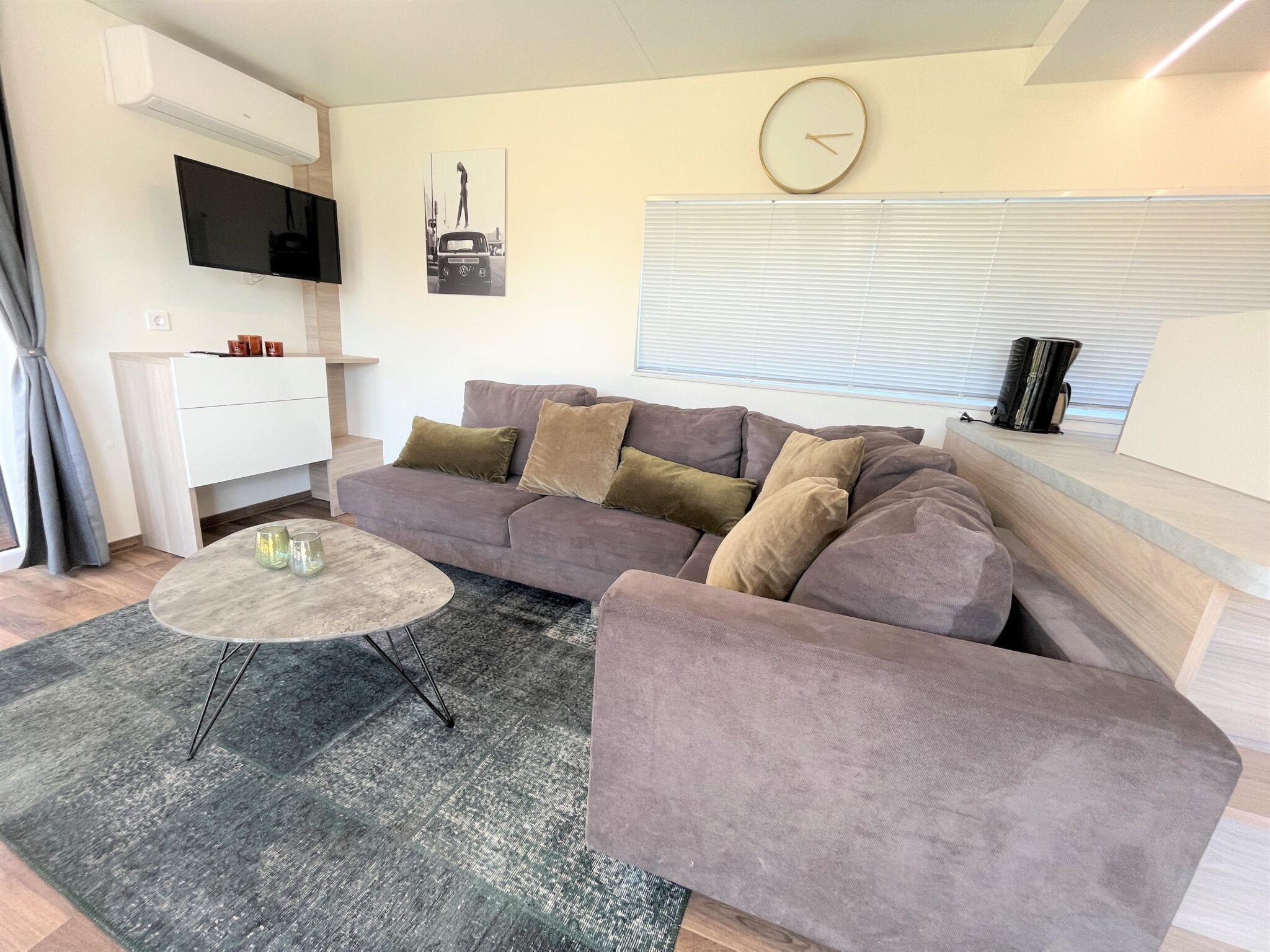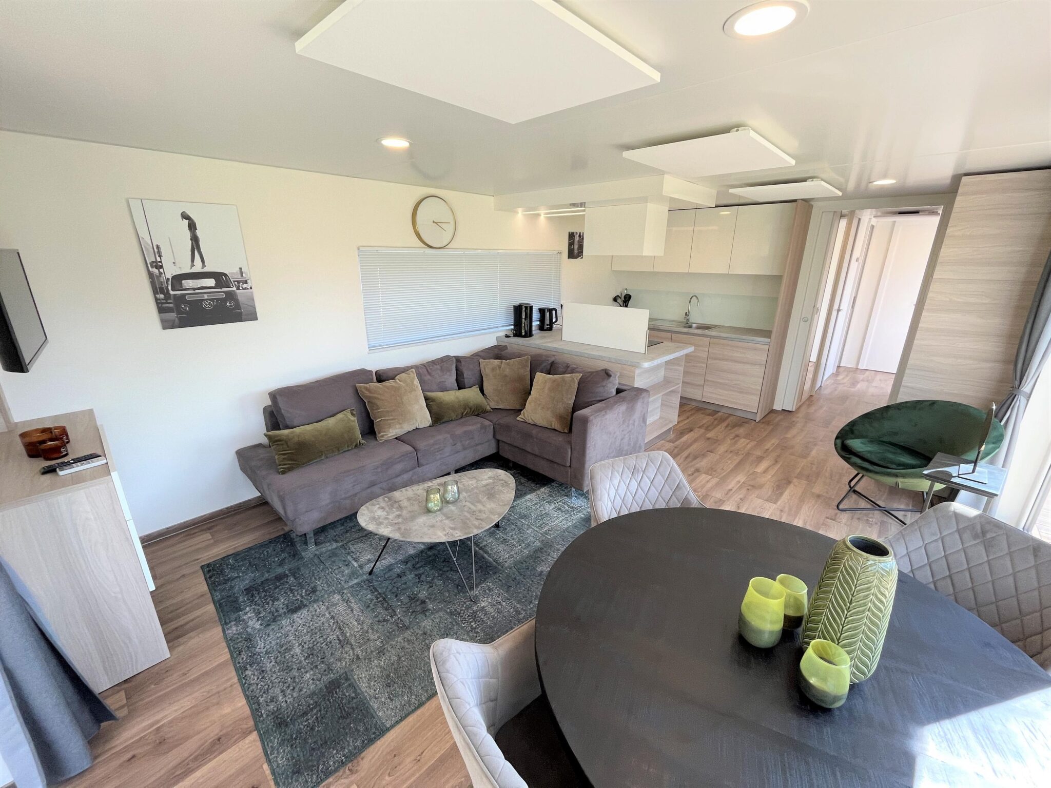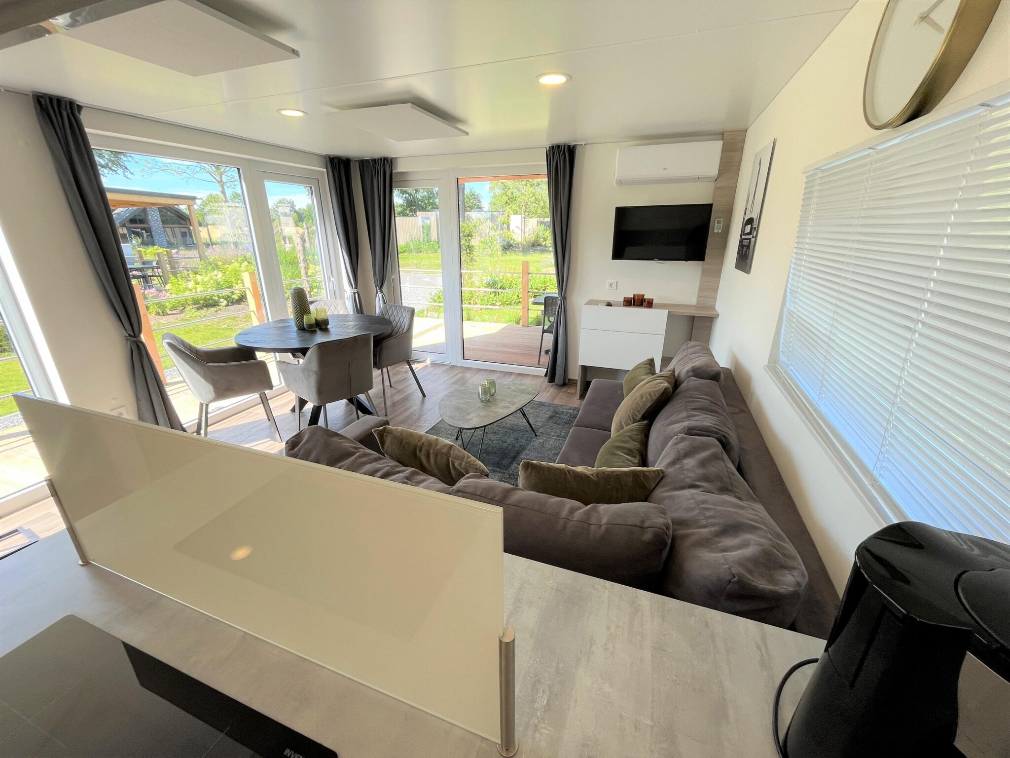 De woning is sfeervol en knus ingericht. Dit ziet u direct terug in de living. Hier zijn de loungehoek, de eethoek en de open keuken gesitueerd. Door de grote raampartijen geniet van veel natuurlijk lichtinval en prachtig uitzicht. De gezellige loungehoek is uitgerust met een ruime hoekbank, een fauteuil, een salontafel en een tv-meubel met daarboven een tv. De zenders hiervan worden ontvangen via een CAI-aansluiting en ook WiFi is geïnstalleerd.
