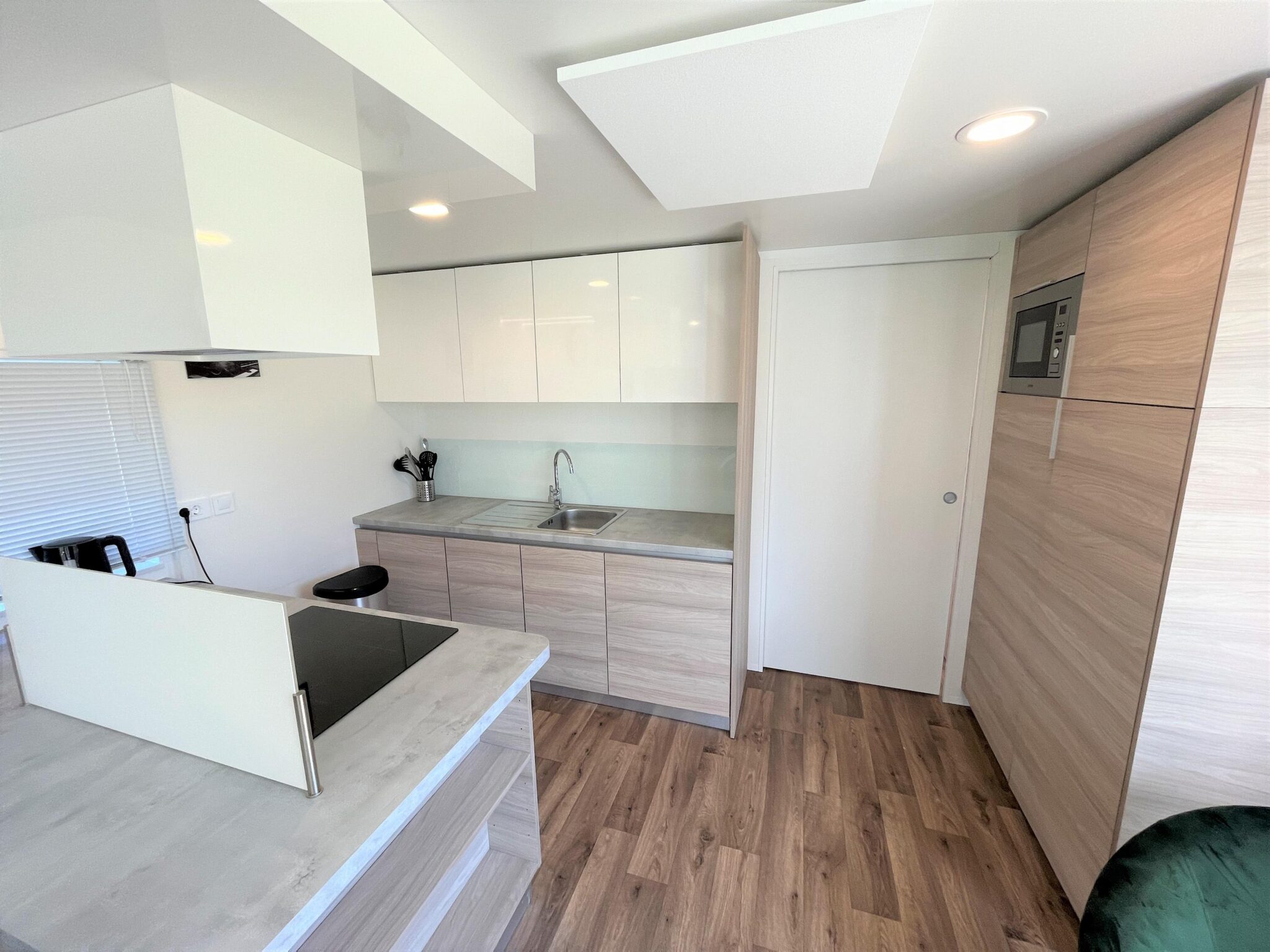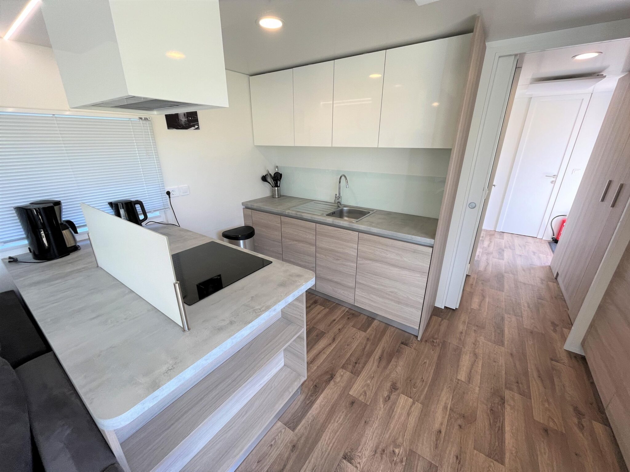 De eethoek is voor het raam geplaatst. Deze is voorzien van een ronde eettafel en vier stoelen. Aangrenzend bevindt zich de open keuken met eiland. Deze is modern afgewerkt en beschikt over een koel-vriescombinatie, een combimagnetron, een vaatwasser en een elektrische kookplaat met afzuigkap.